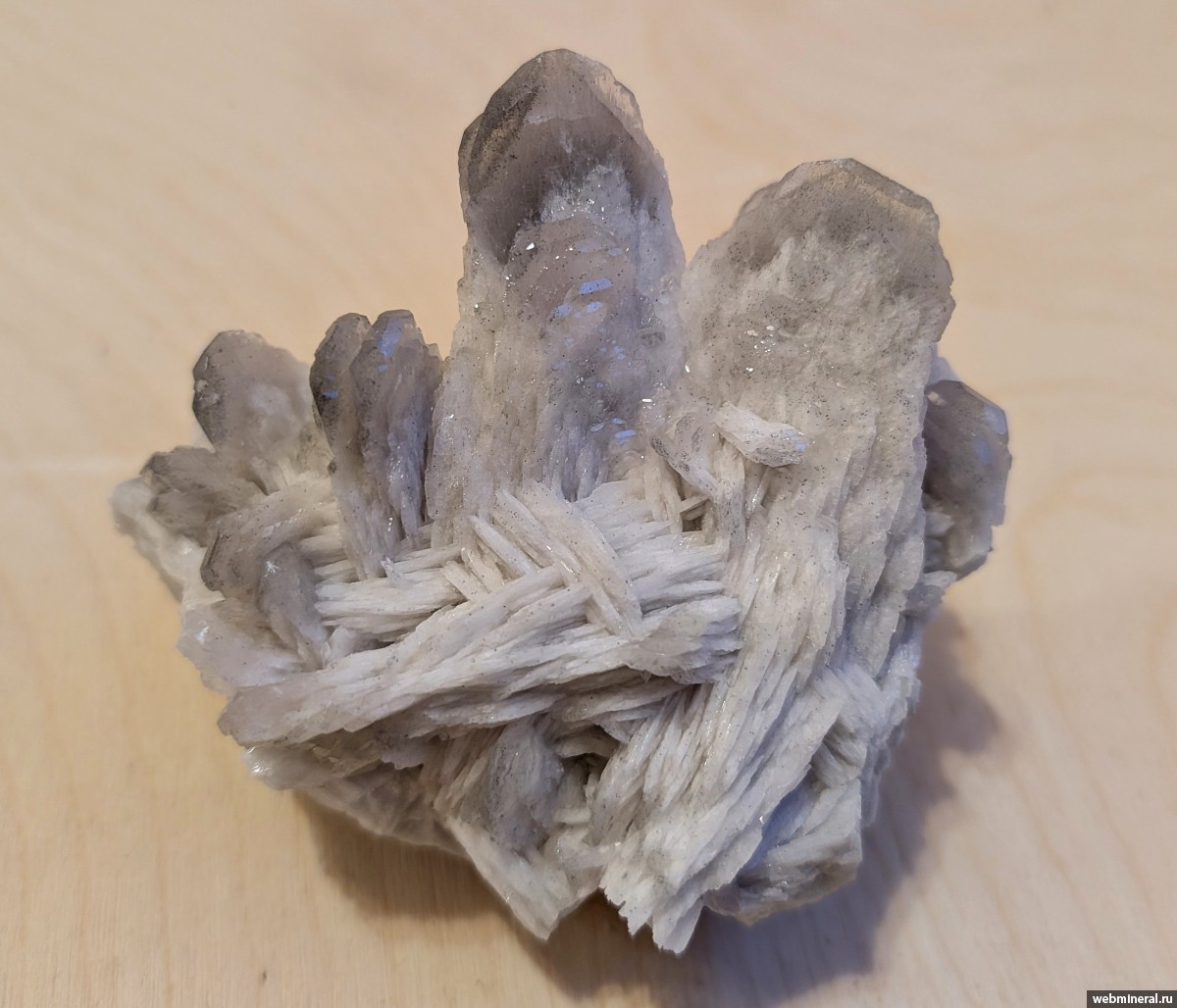Доуза кристаллов белого барита интересной морфологии. Основание друзы сложено массивным баритом, покрытым его тонкопластинчатыми расщепленными кристаллами, вершины которых переходят в параллельные сростки полупрозрачных неращепленных индивидов. Серый цвет верхушек кристаллов барита обусловлен включениями пылевидного пирита. Находка - 2025 год.