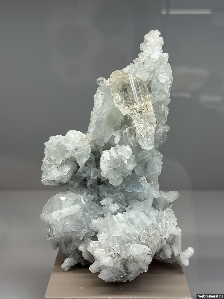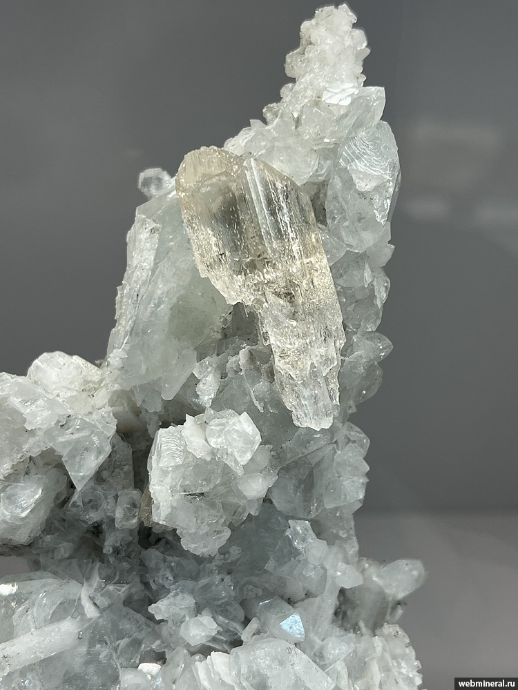 Частично растворенный бесцветный кристалл данбурита длиной около 4,5 см на друзе серо-зеленого датолита с белым кварцем. Образец из коллекции Зоммера Б.К.