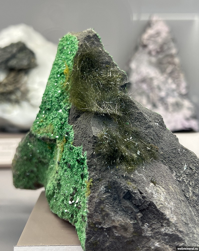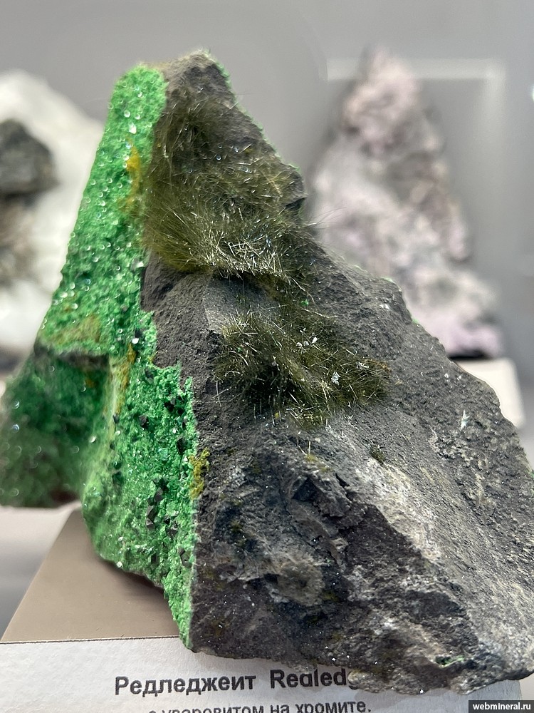 Игольчатые кристаллы редледжеита длиной до 1 см с уваровитом на хромите. Образец из коллекции Медведева В.А.