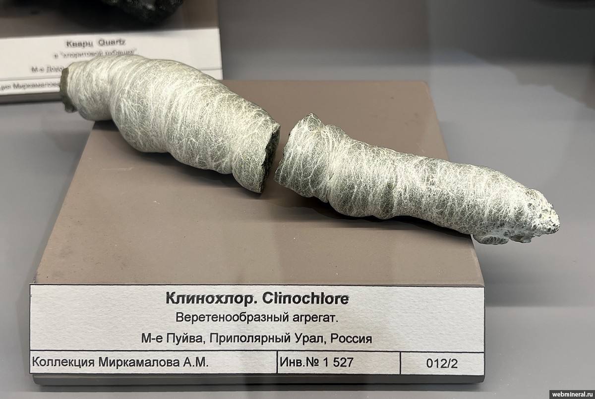 В номере Минералогического альманаха по Приполярному Уралу похожий агрегат назвается "шишковидным образованием хлорита с примесью тремолит-асбеста". Страницы 117-118, фотография образца на стр. 117, Илл. 202.