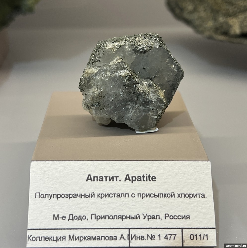 Полупрозрачный плоский кристалл апатита с присыпкой хлорита по граням призмы. Образец из коллекции Миркамалова А.М.