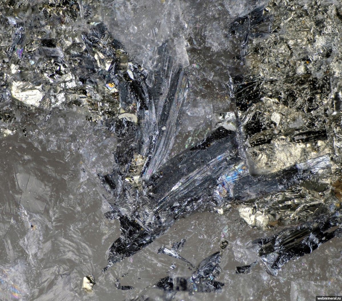 Кристаллы серого игольчатого козалита в ассоциации с пиритом в кварце.