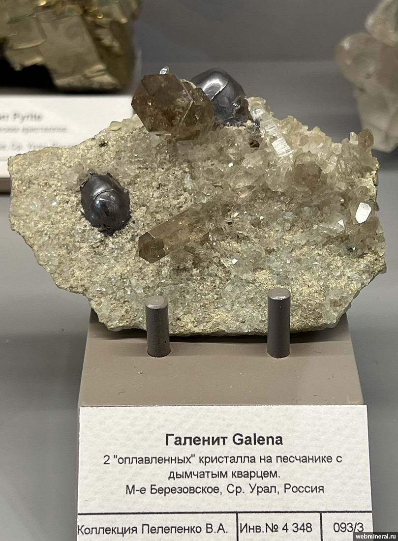 Два округлых "оплавленных" кристалла галенита размером около 1 см с дымчатым кварцем на песчанике. Образец из коллекции Пелепенко В.А.