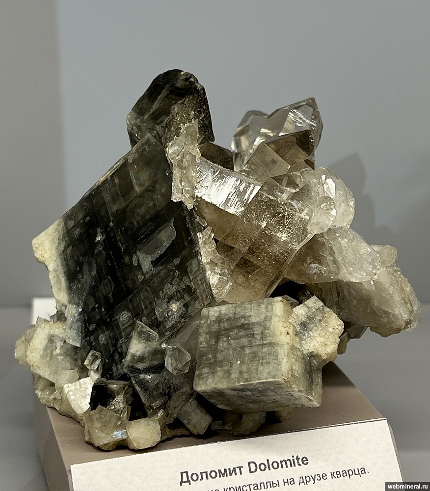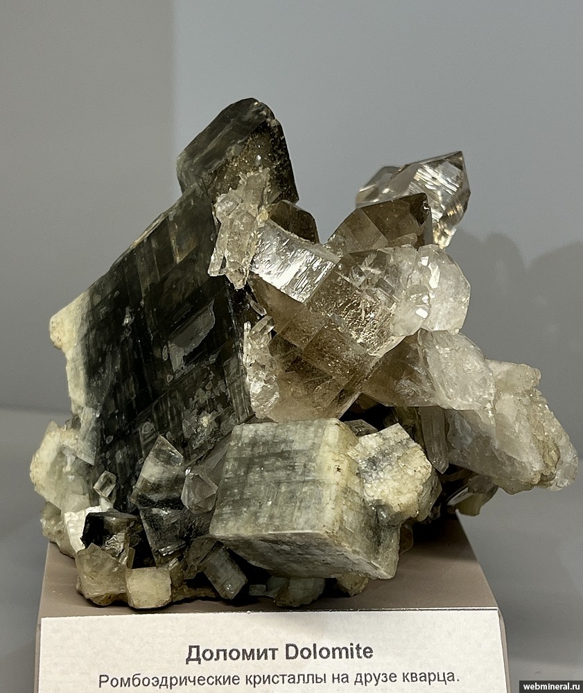 Ромбоэдрические кристаллы желтовато-серого доломита на друзе кварца. Образец из коллекции Пелепенко В.А.