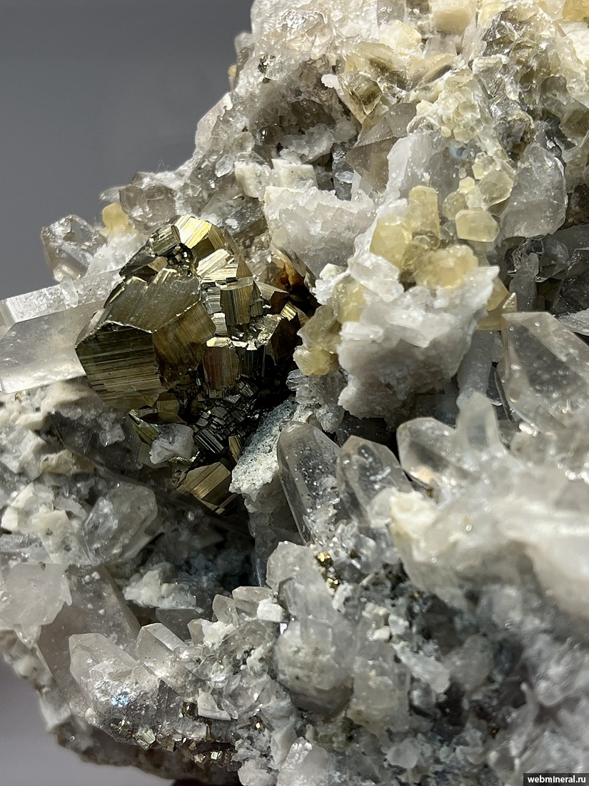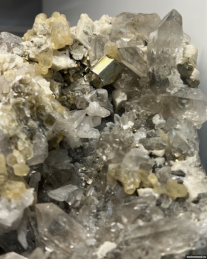 Друза сложенная кристаллами пирита (огранка - пентагондодекаэдр) размером до 2 см, прозрачными кристаллами кварца длиной до 4 см, желтым кальцитом и кристаллами доломита размером до 2 см. Образец из коллекции музея "Планета". Друза интересна богатым набором минералов (4 минвида).