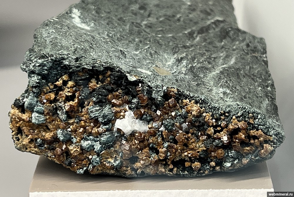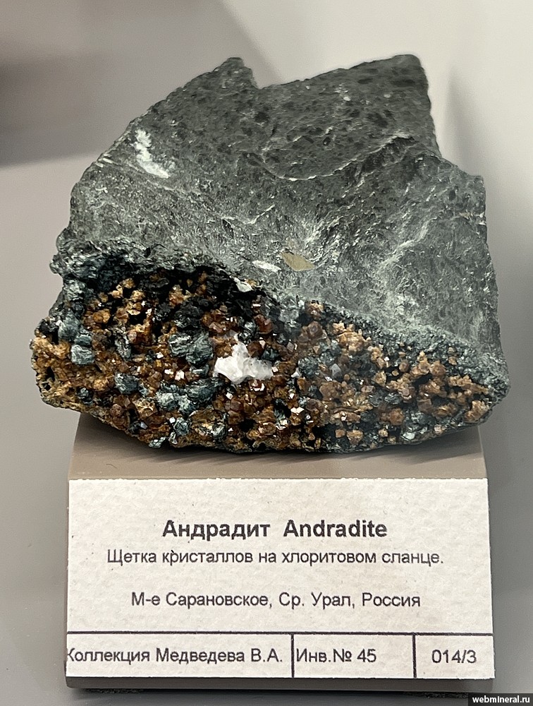 Щетка коричневых кристаллов андрадита размером до ~ 3 мм на хлоритовом сланце. Гранат вытравлен из-под кальцита, остатки которого видны в центре образца. Образец из коллекции Медведева В.А.