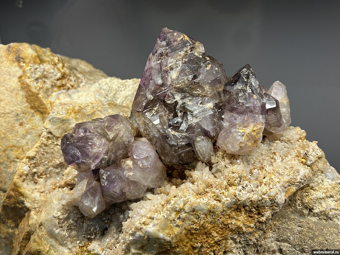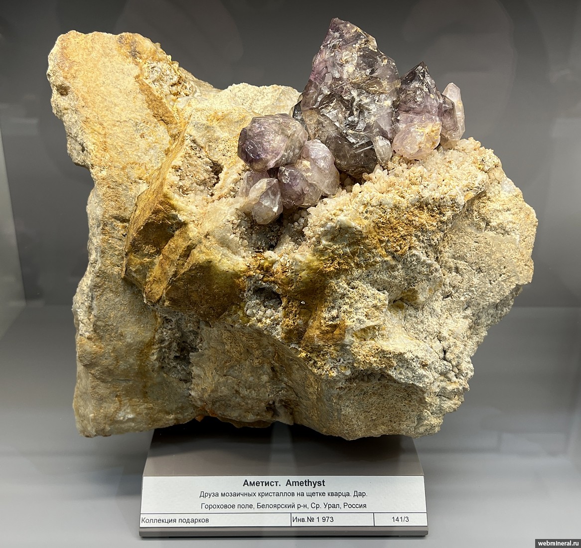 Кристаллы аметиста высотой до 7 см на щетке из мелких кристаллов бесцветного кварца. Коллекция подарков.