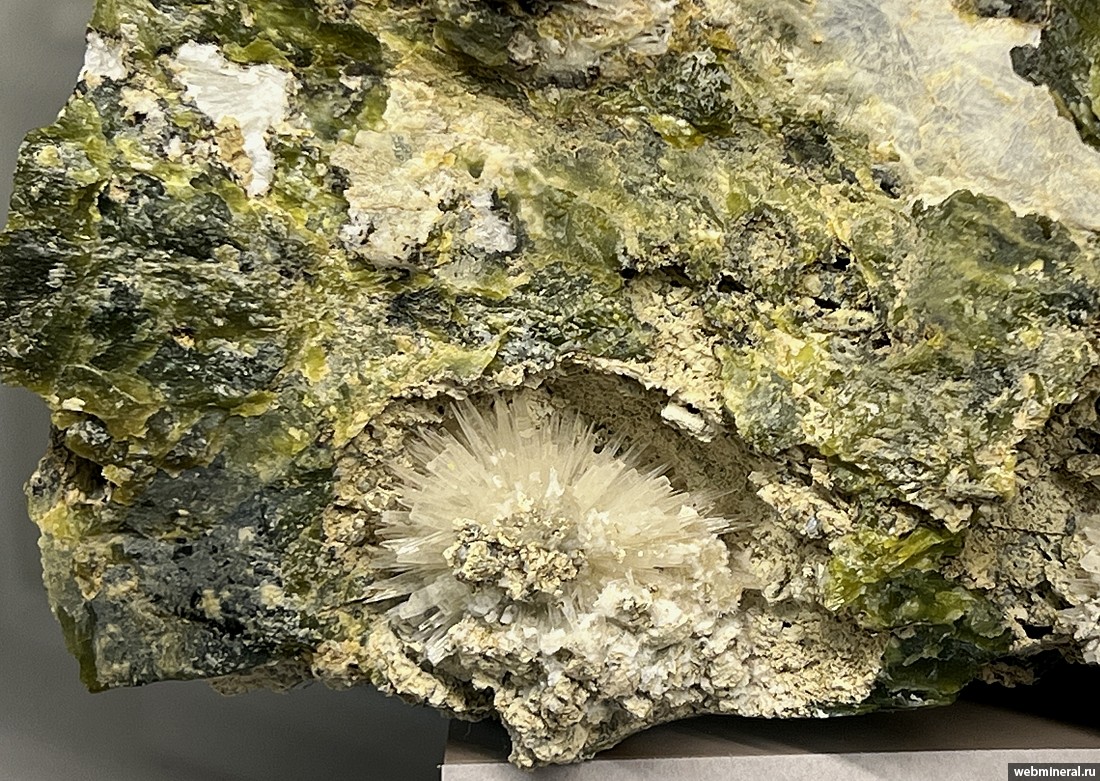 Сферолитовый сросток игольчатых кристаллов арагонита в серпентините. Образец из коллекции Медведева В.А.
