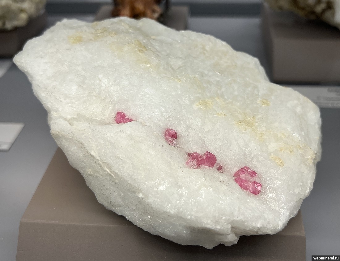 Кристаллы розовой шпинели размером до 1 см в кальците. Образец из коллекции Пелепенко В.А.