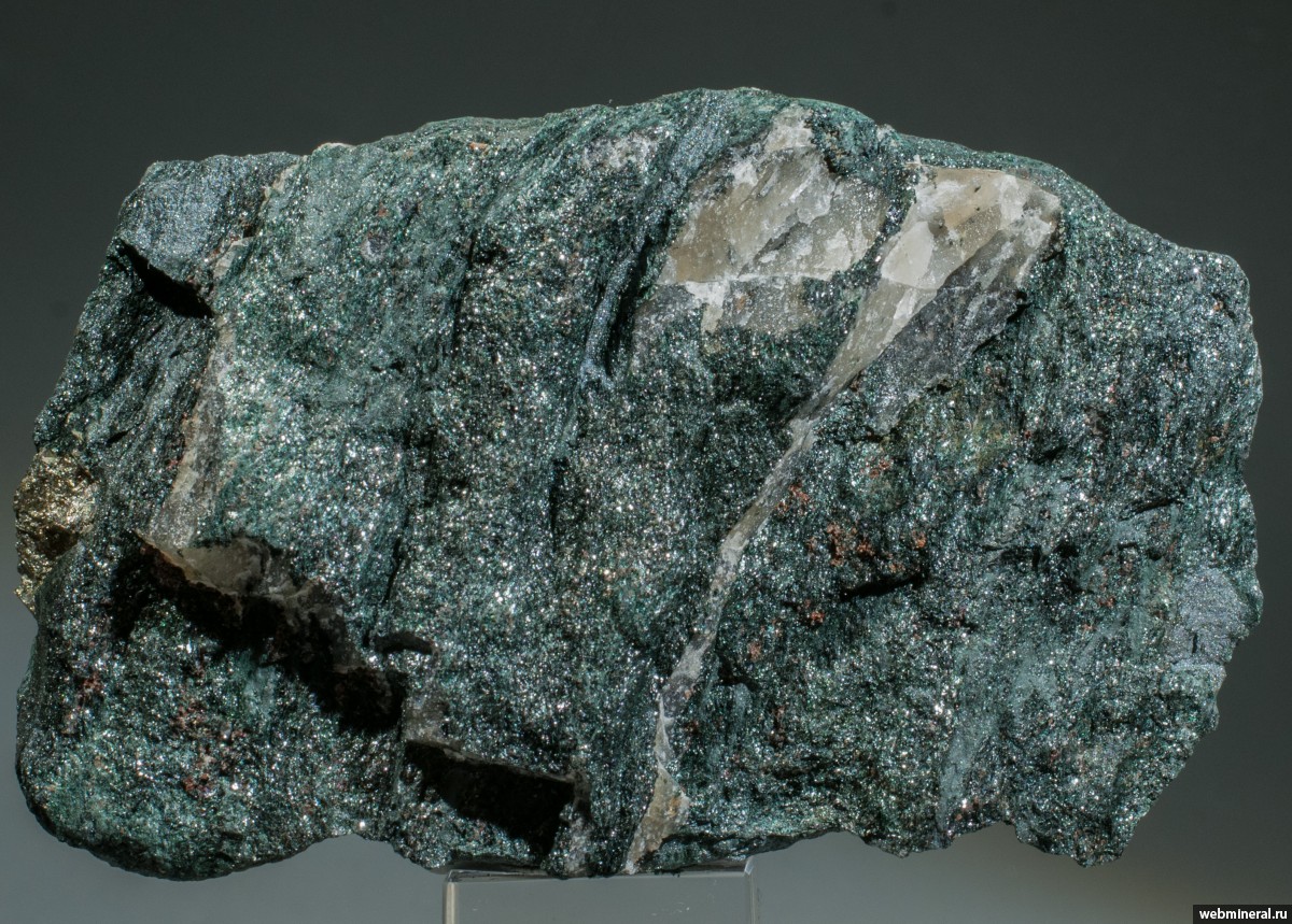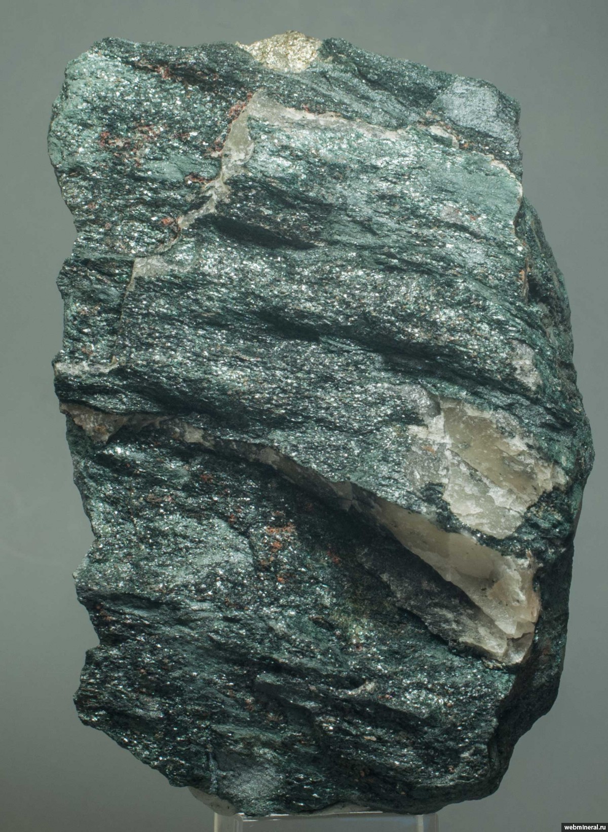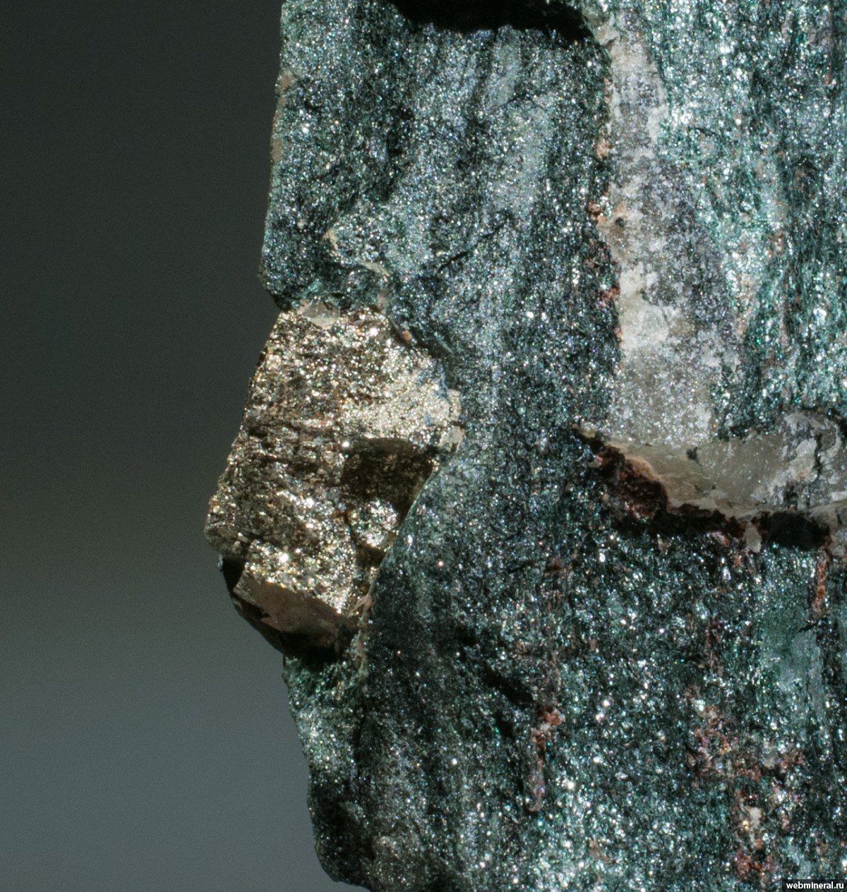 Зелёный тонкочешуйчатый ферроселадонит с кварцем и пиритом в изменённом железистом кварците из зоны контакта с порфировой дайкой. Из сборов начала 1980-х годов.