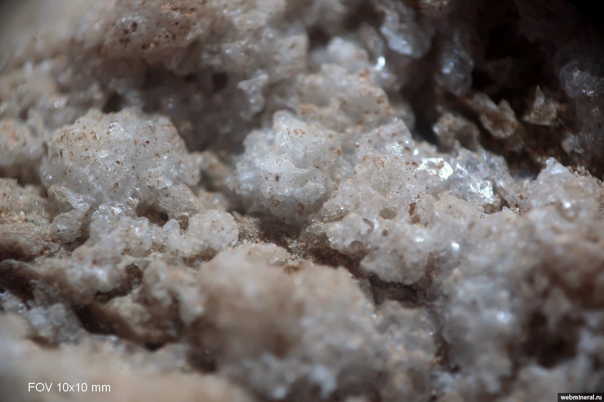 Фрагмент типичной мелкокристаллической гипсовой коры, сложенной бесцветными, частично растворенными кристаллами (см. дочернее фото), которая нарастает на темно-коричневую брекчию (? – гравитационная брекчия) более раннего гипса (см. дочернее фото, окраска вызвана включением глинистого вещества).