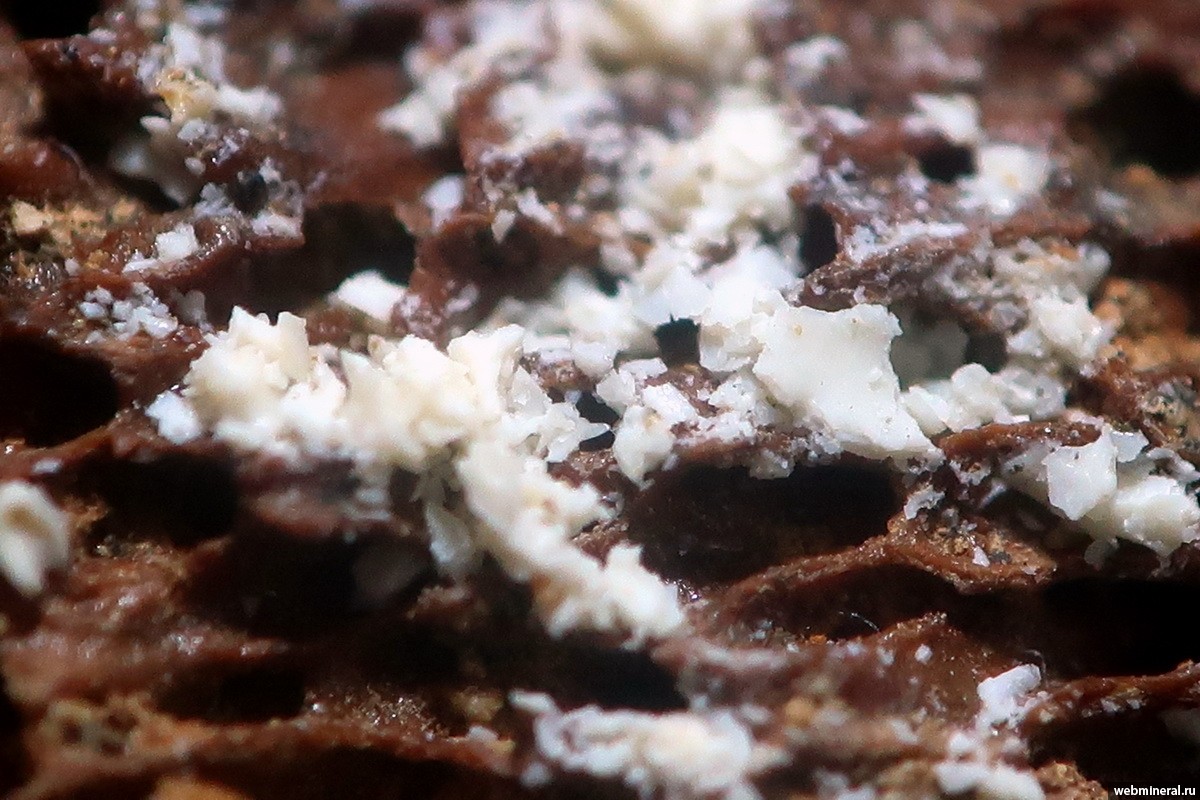 Обломок ископаемой кости крупного млекопитающего, на её внутренней поверхности, участками, наблюдаются матово-белые пластинки гидроксилапатита размером до 1 мм и их сростки.