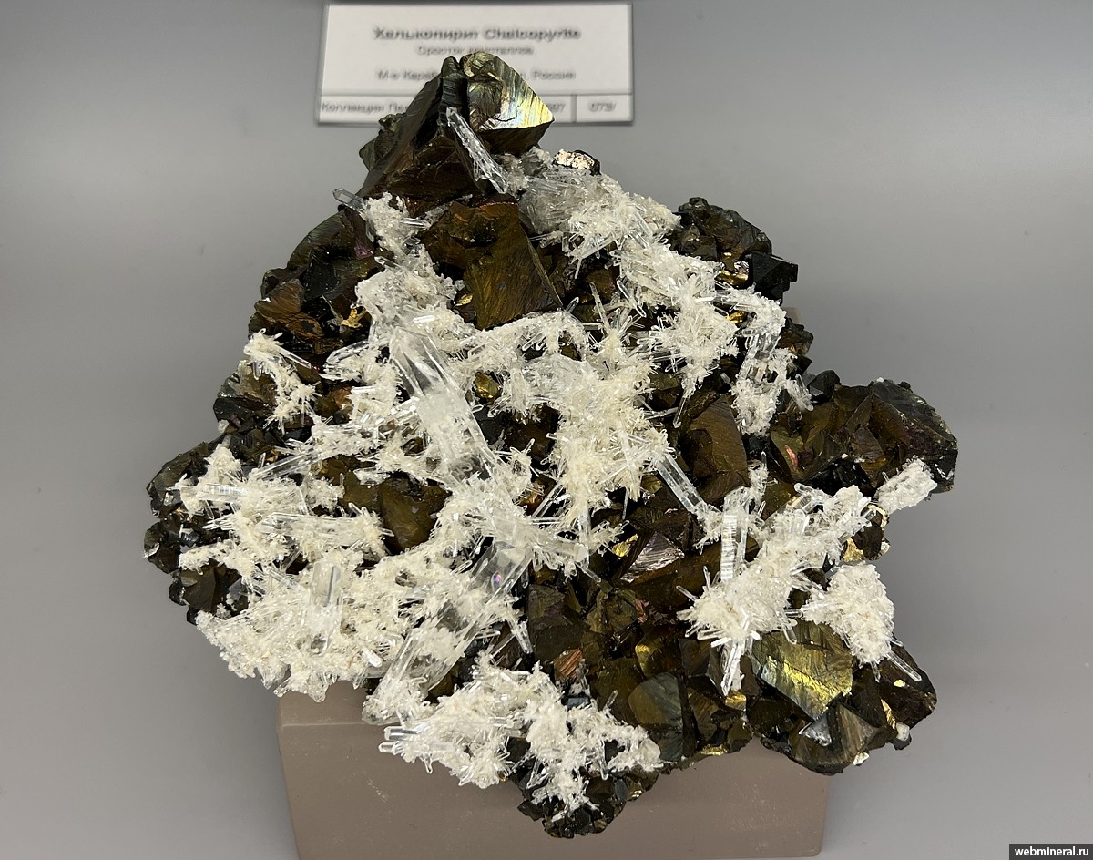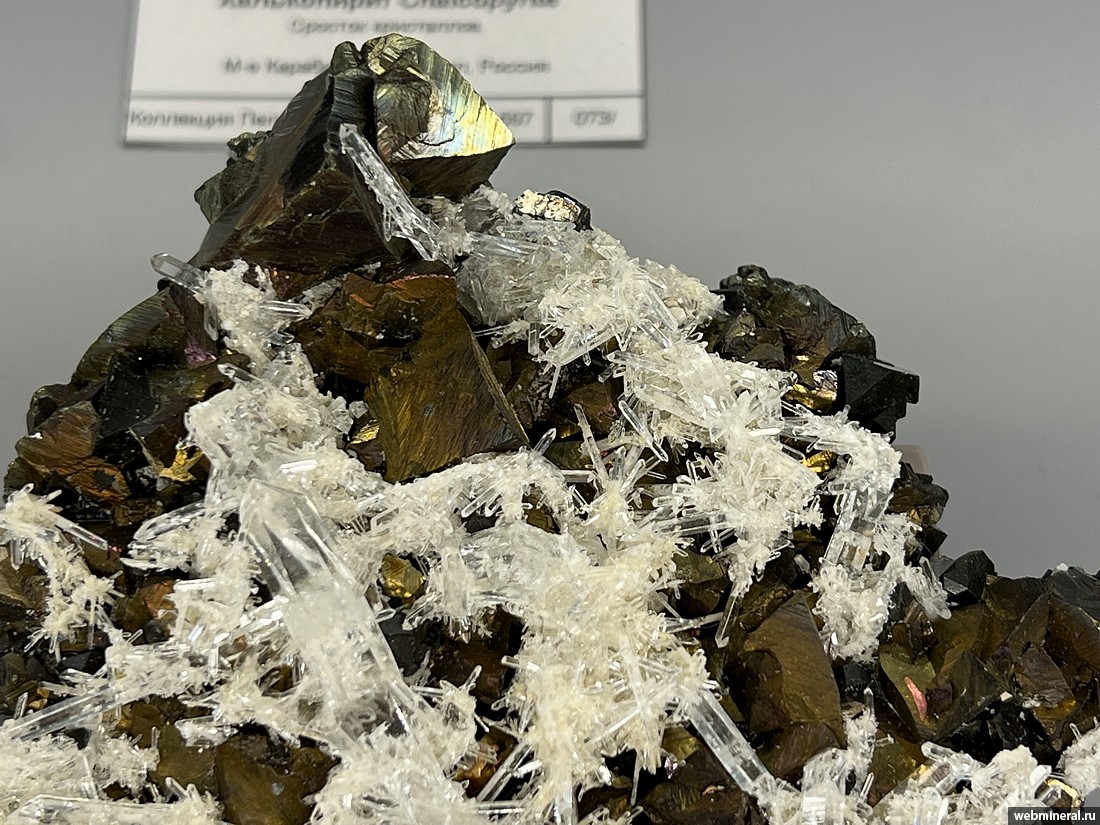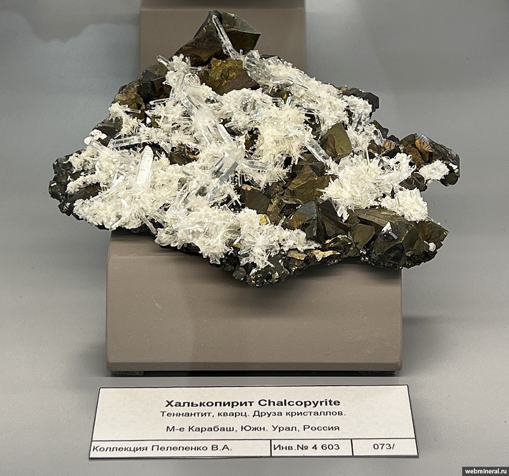 Друза кристаллов халькопирита размером до 3 см с кристаллами кварца длиной до 4 см и теннантитом. Образец из коллекции Пелепенко В.А.