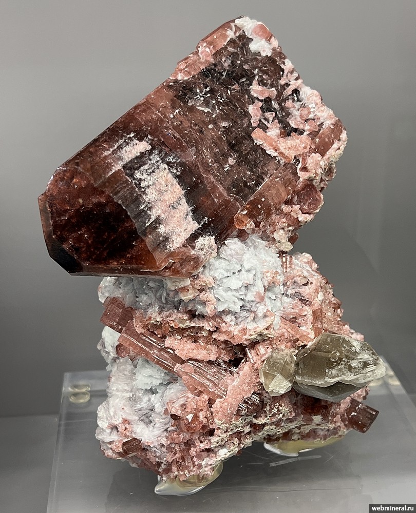 Друза кристаллов эльбаита длиной до 10 см с дымчатым кварцем и альбитом. Образец из коллекции Ивонина А.В.