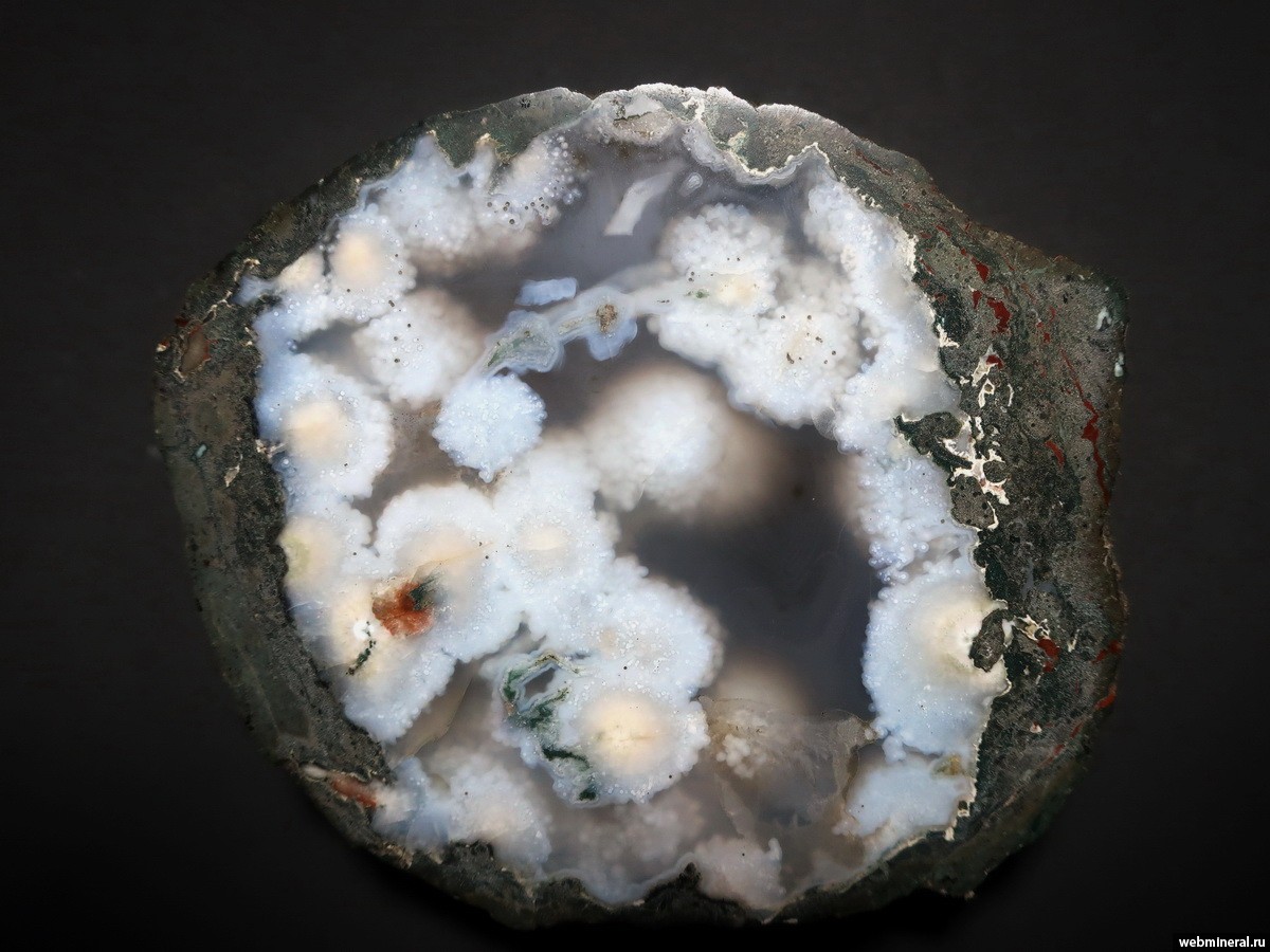 Полированный срез халцедонового светло-серого агата с округлыми белыми кварциновыми псевдоморфозами по сферолитовым пучкам цеолитов. Сбор: 1970-е гг., Полканов Ю.А. (Институт минеральных ресурсов, Симферополь). Геологический музей им. Н.И. Андрусова (Крымский федеральный университет), обр. № ГМ-0365.