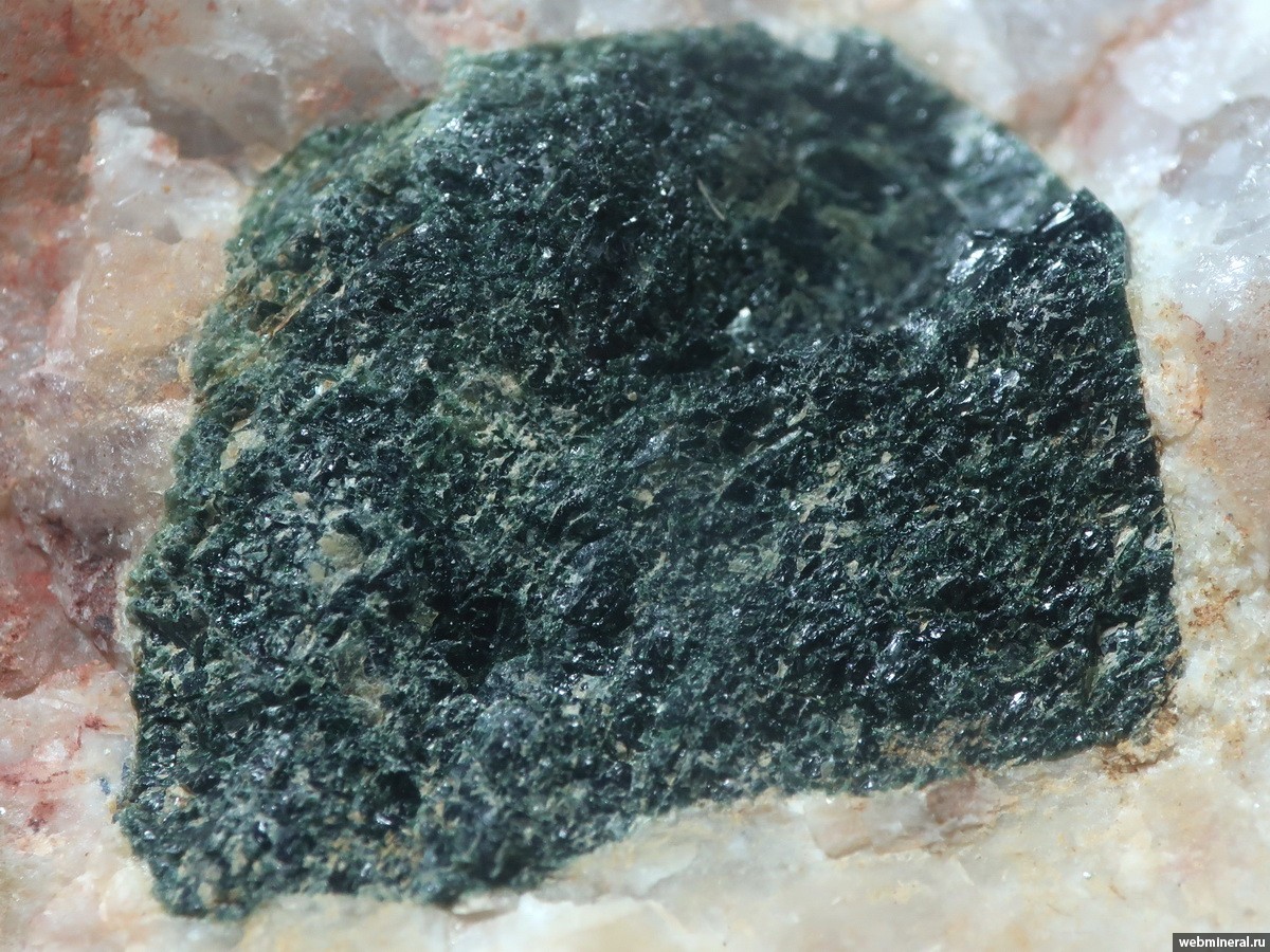 Трещиноватое темно-зеленое зерно ганита в кварц-полевошпатовом агрегате.