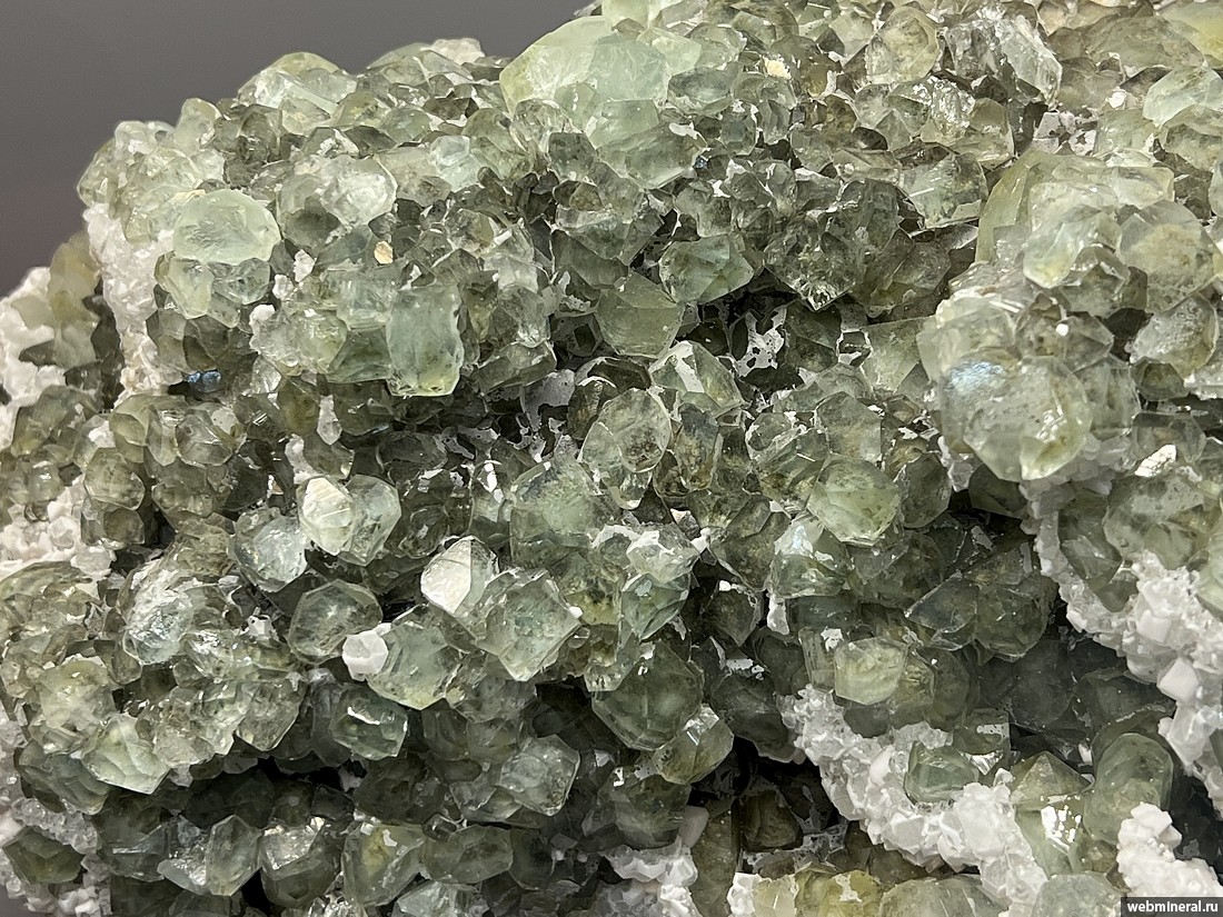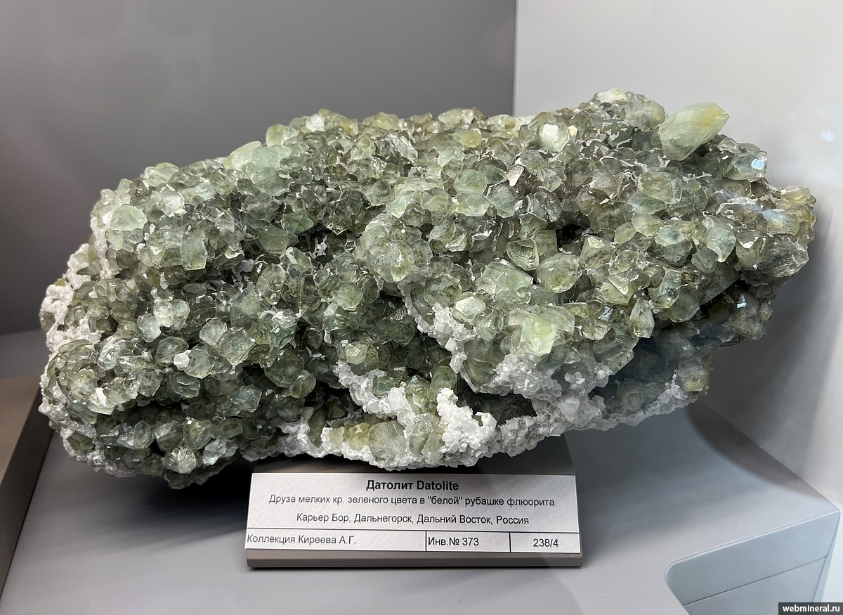 Друза мелких кристаллов датолита зеленого цвета в белой "рубашке" флюорита. Образец из коллекции Киреева А.Г.