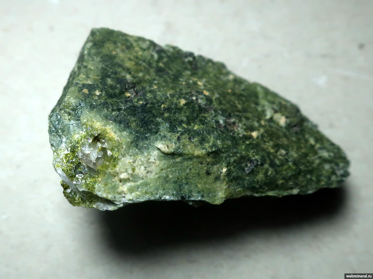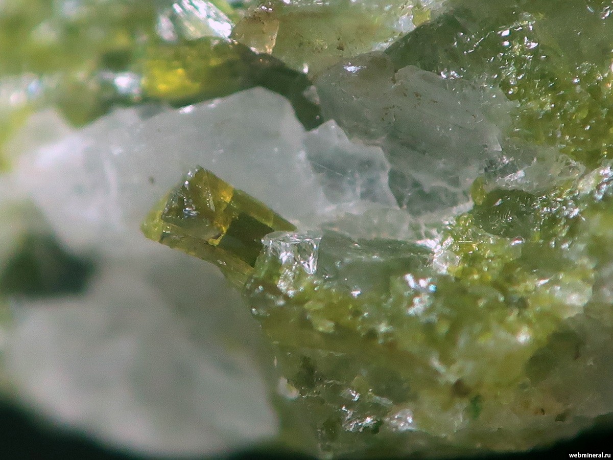 Зернистые агрегаты и несовершенные кристаллы размером до до 2 мм желтовато-зеленого цвета в ассоциации с кварцем и кальцитом.