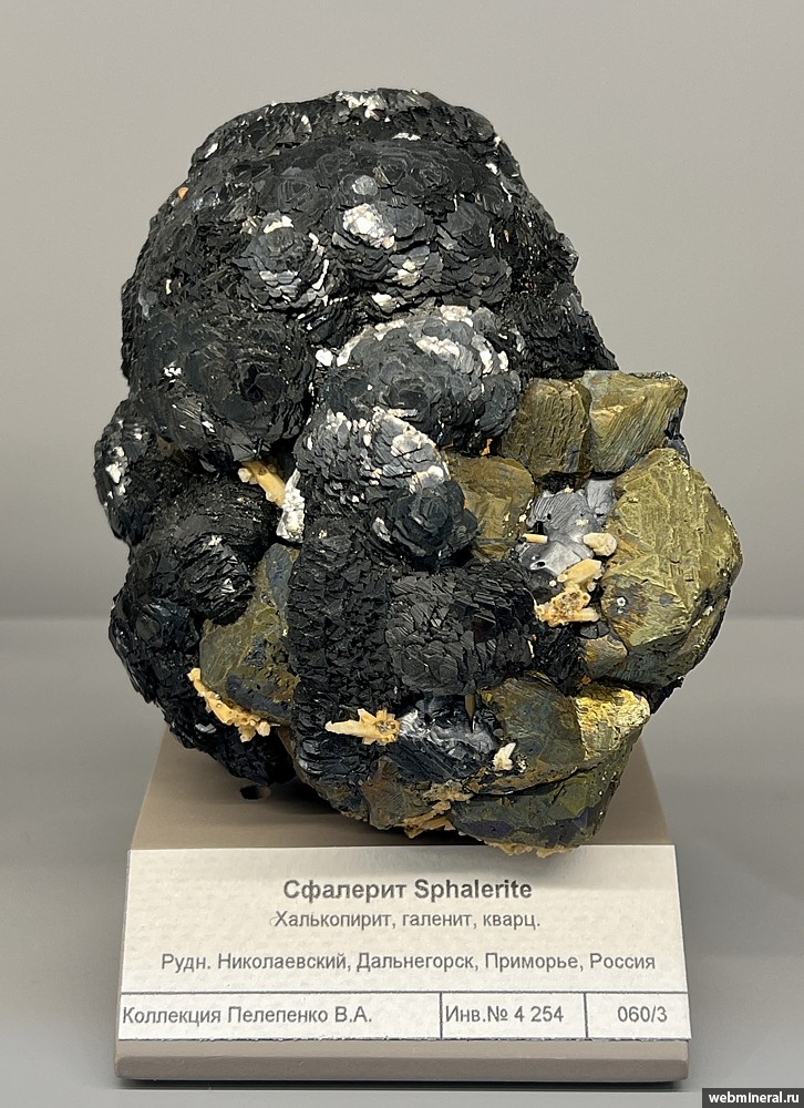 Сросток кристаллов темного сфалерита (с характерным блочным строением граней), желтого халькопирита, голубовато-серого галенита и желтоватых кристаллов кварца. Образец из коллекции Пелепенко В.А.