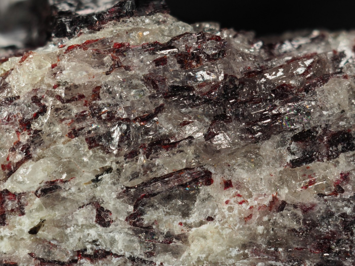 Бесцветные удлинённые зёрна нефедовита, находящиеся в субграфическом срастании с красным виллиомитом. Флуоресценция в уф 365нм / фото в обычном освещении. Сбор И.В. Пеков, 2008г.