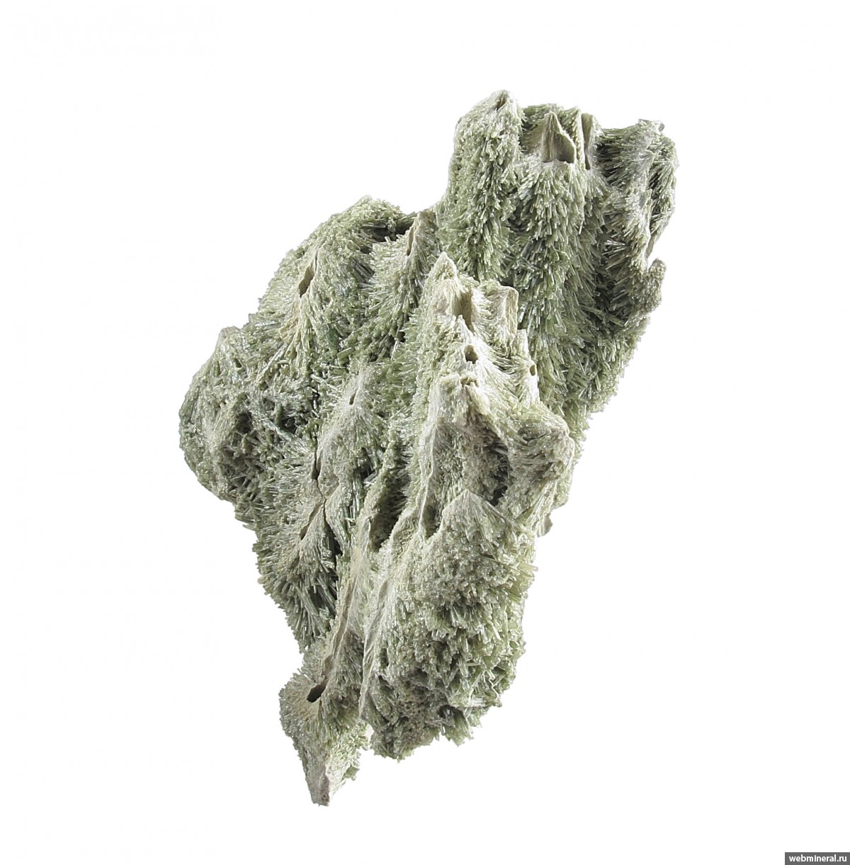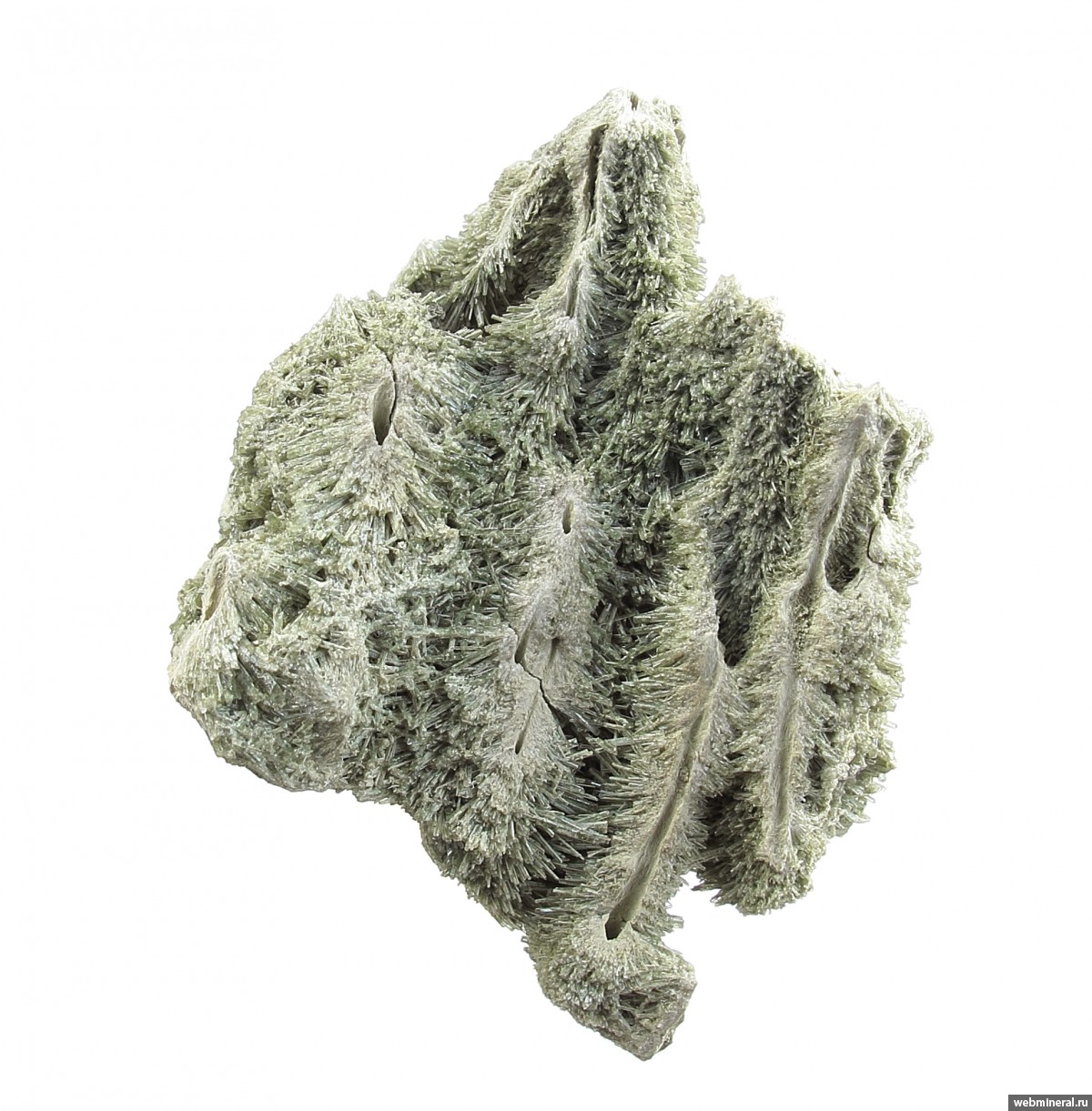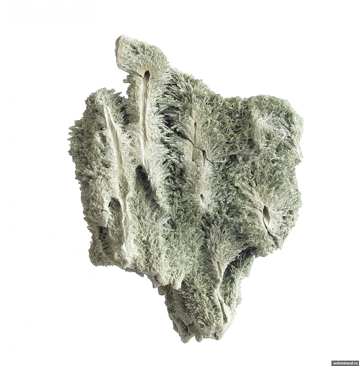 Тесно сросшиеся мономинеральные агрегаты диопсида в виде полых трубок, обросших щётками тонких немного уплощённых длиннопризматических кристаллов. Стенки трубок сложены белёсыми волокнистыми кристаллами. От стенок идёт расщеплённый рост, на удалении от каналов размер кристаллов увеличивается, и формируются друзовые агрегаты полупрозрачных кристаллов. Цвет - пыльный серовато-зелёный, светлый. Сборы 2025 г.