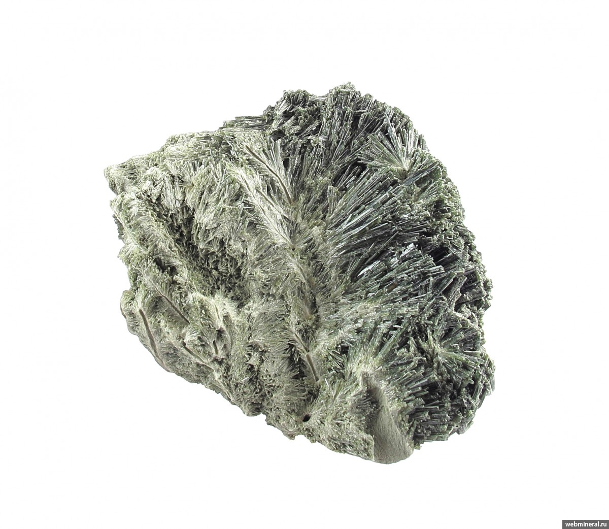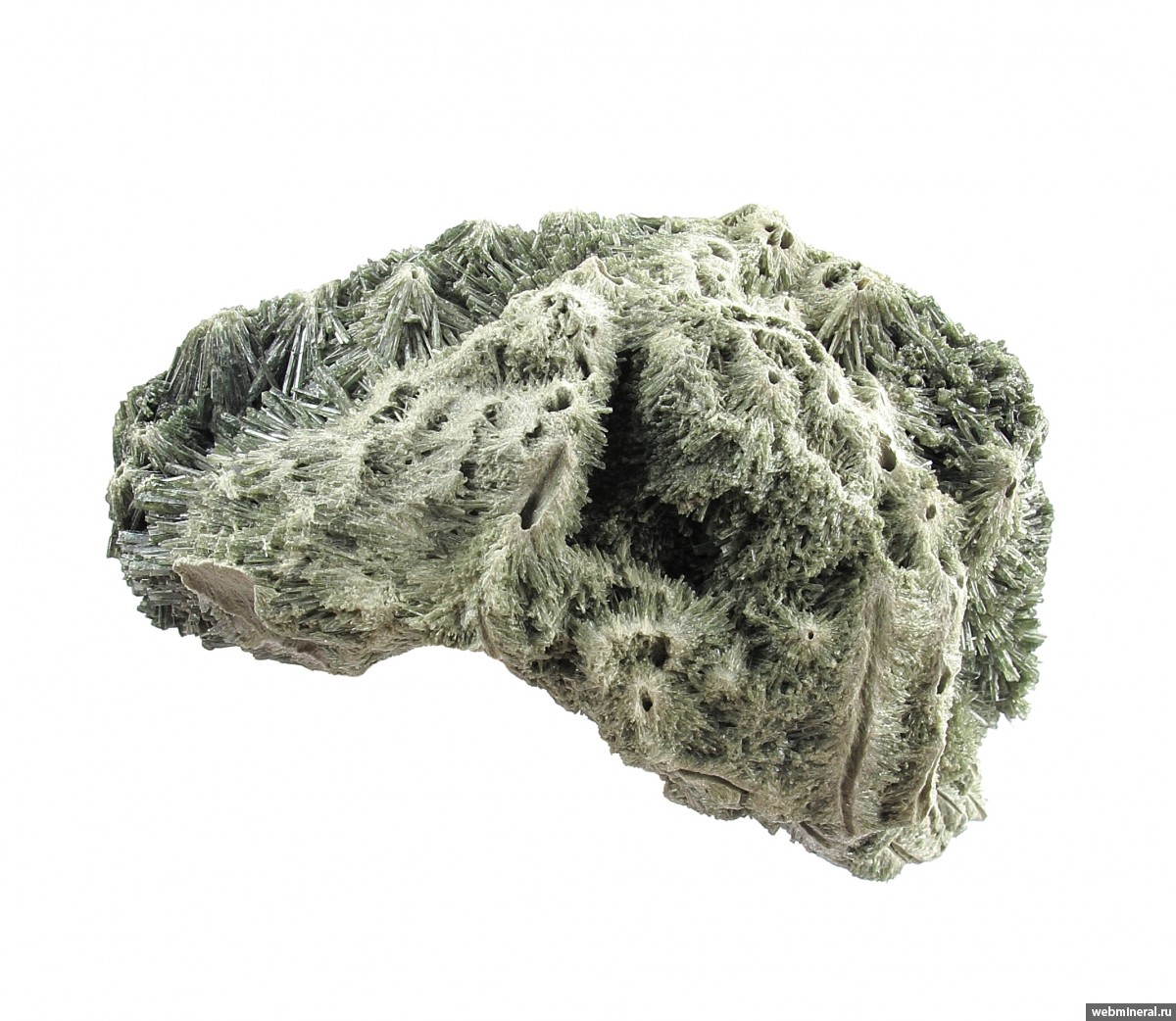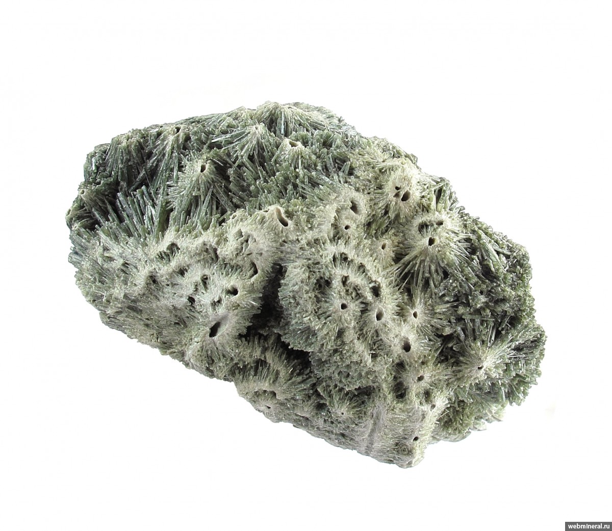 Сросшиеся в объёмную друзовую корку мономинеральные агрегаты диопсида в виде полых трубок, обросших щётками тонких немного уплощённых длиннопризматических кристаллов. Стенки трубок сложены белёсыми волокнистыми кристаллами. От стенок идёт расщеплённый рост, на удалении от каналов размер кристаллов увеличивается, и формируются друзовые агрегаты полупрозрачных кристаллов. Цвет серовато-зелёный. Сборы 2025 г.