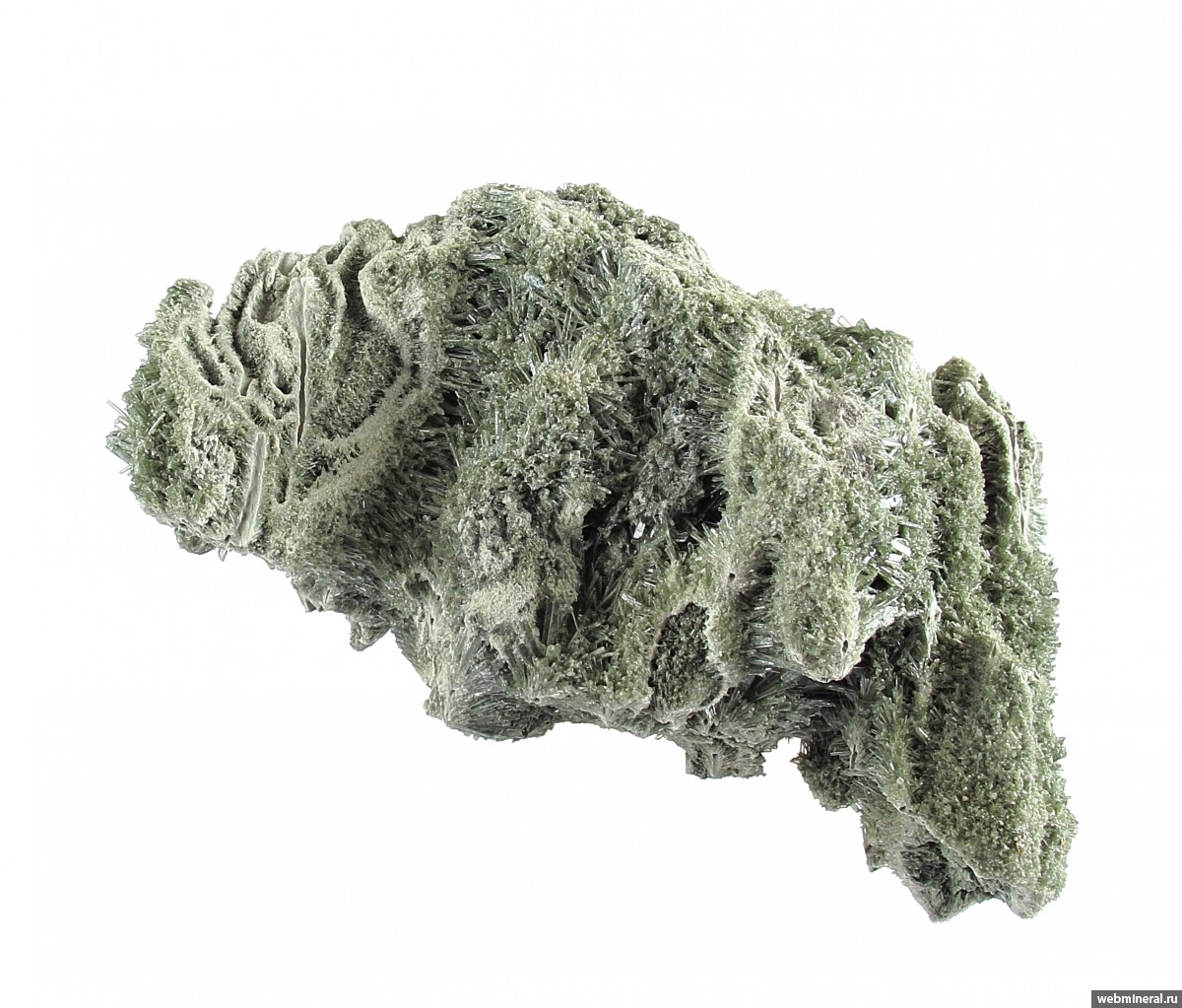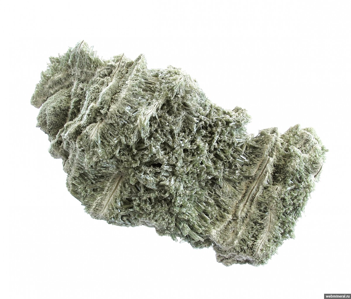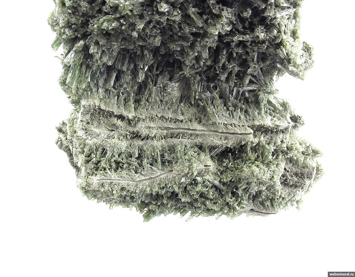 Сросшиеся в объёмную друзовую корку мономинеральные агрегаты диопсида в виде полых трубок, обросших щётками тонких немного уплощённых длиннопризматических кристаллов. Стенки трубок сложены белёсыми волокнистыми кристаллами. От стенок идёт расщеплённый рост, на удалении от каналов размер кристаллов увеличивается, и формируются друзовые агрегаты полупрозрачных кристаллов. Цвет серовато-зелёный. Сборы 2025 г.
