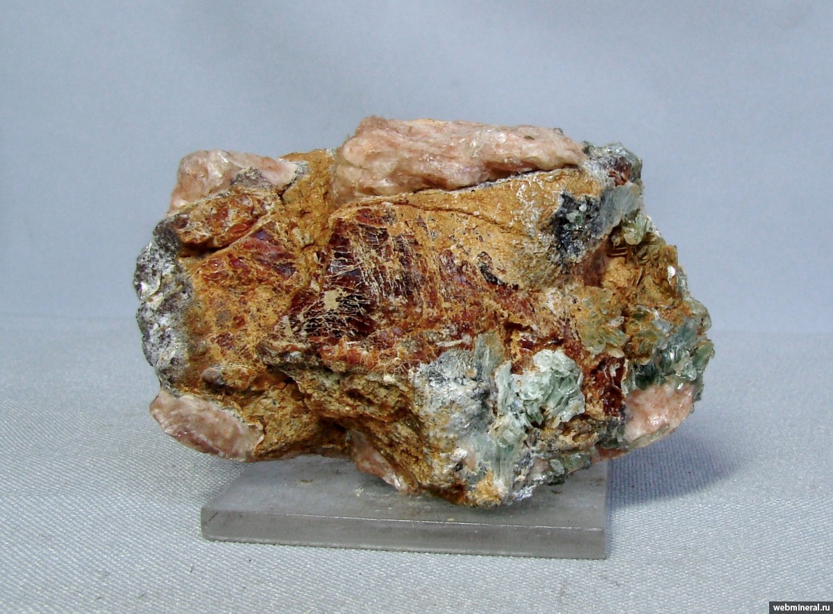 Оранжево-красные, сломанные кристаллы гидроксилклиногумита, занимающие почти всю площадь этой стороны образца, в ассоциации с розовым листоватым гидроталькитом на периферии и сростками серо-зелёных кристаллов клинохлора.