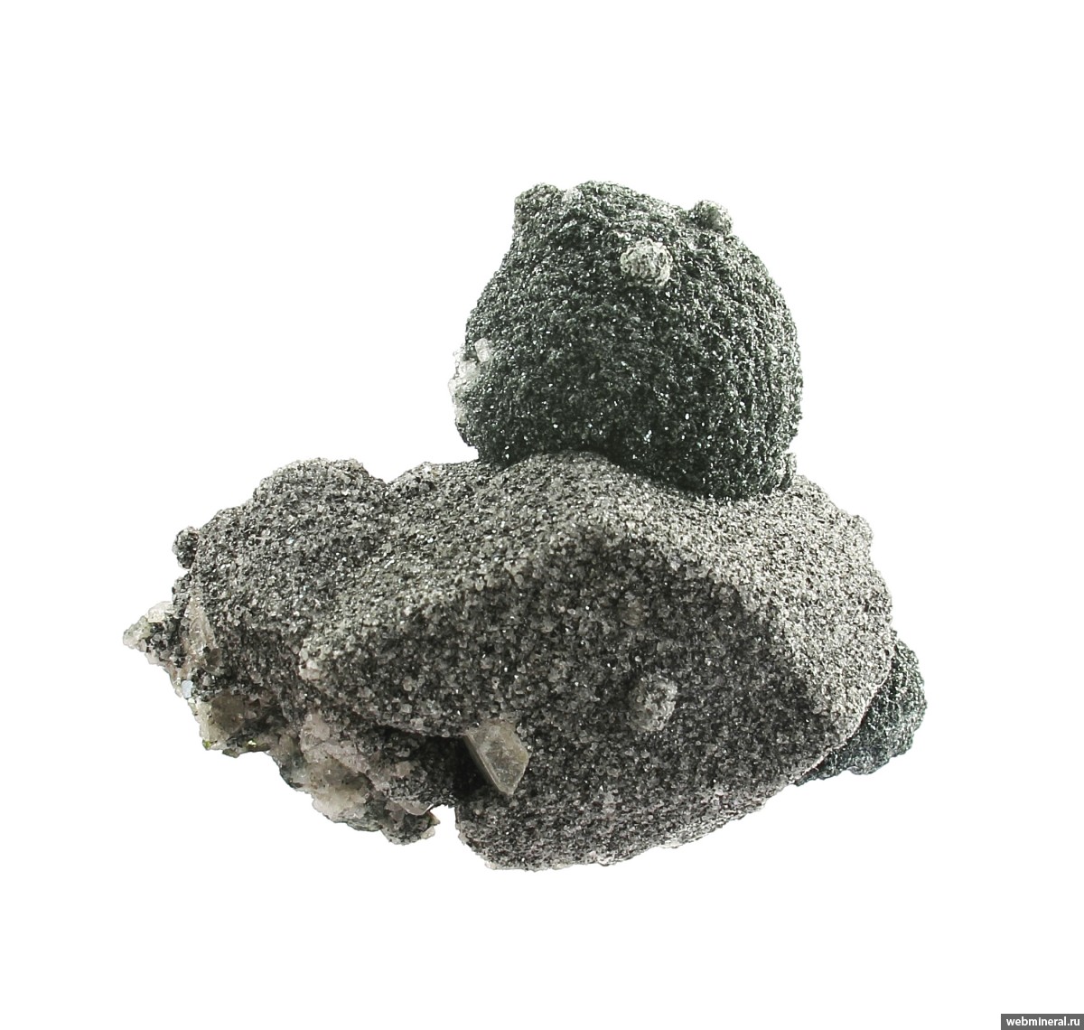 Тёмно-зелёные cферолиты хлорита (4 и 3 см в диаметре) на кристалле альбита (7 см), покрытом зернистой корочкой хлорита с альбитом. Мелкие белёсые округлые скопления (до 5мм) также сложены зёрнами альбита с хлоритом. Сферолит хлорита на обратной стороне образца сколот, на сколе видно, что он сложен хаотично ориентированными кристаллами.
