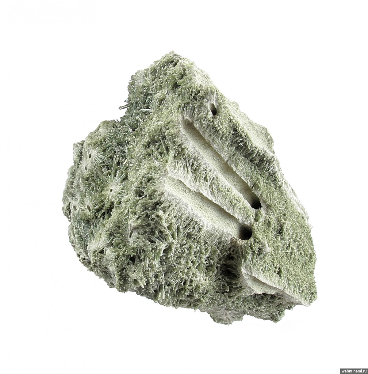 Тесно сросшиеся мономинеральные агрегаты диопсида в виде полых трубок, обросших щётками тонких немного уплощённых длиннопризматических кристаллов. Стенки трубок сложены белёсыми волокнистыми кристаллами. От стенок идёт расщеплённый рост, на удалении от каналов размер кристаллов увеличивается, и формируются друзовые агрегаты полупрозрачных кристаллов. Цвет - пыльный серовато-зелёный, светлый. Сборы 2025 г.