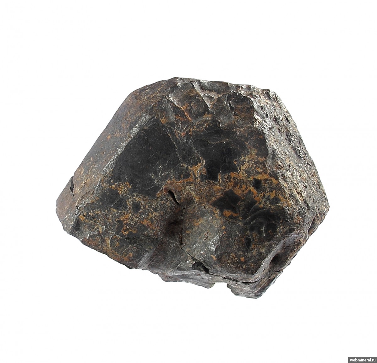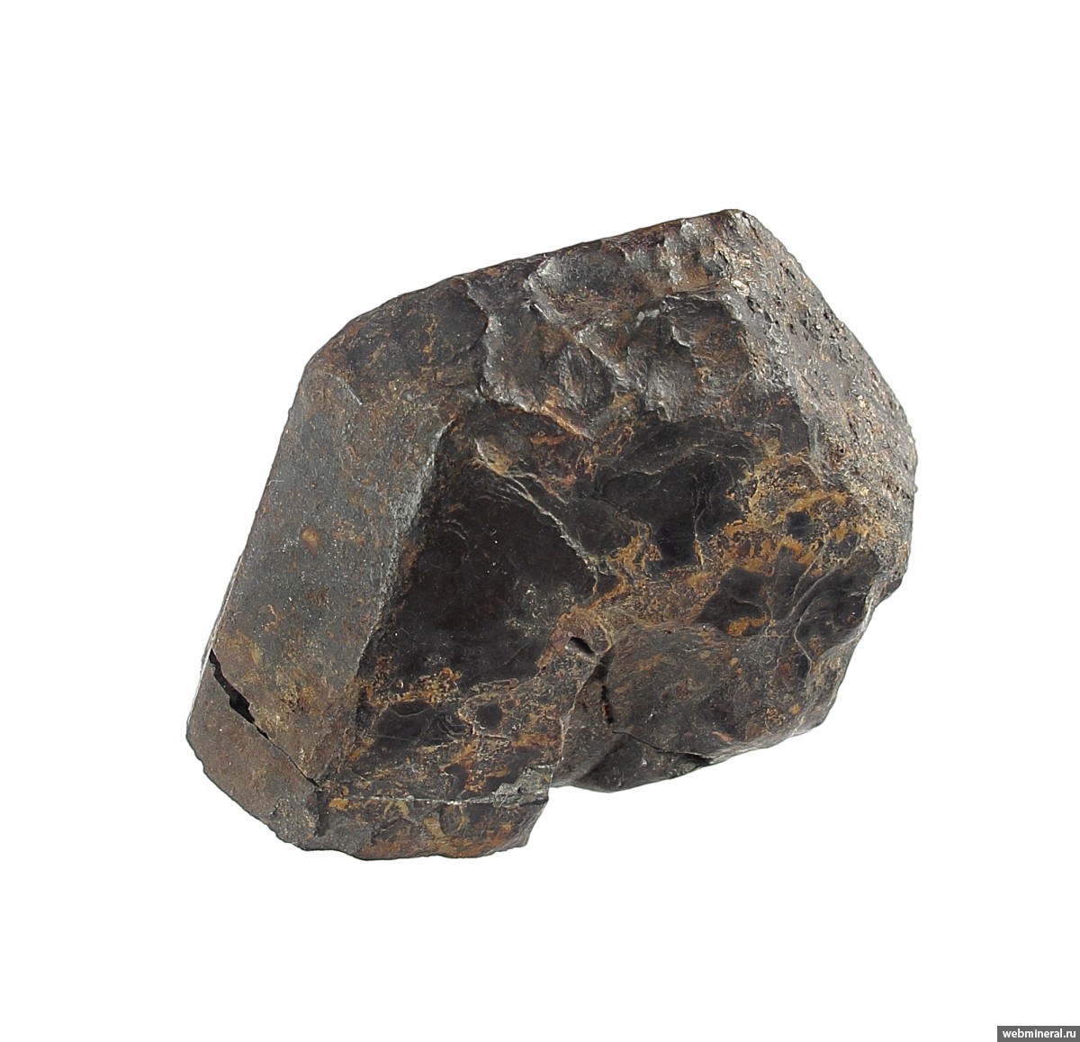 Толстотаблитчатый кристалл ильменита с «мятой» гранью, трещинами и кавернами (?отпечатками). Поверхность граней в основном тусклая в охристых корочках продуктов изменения ильменита. Вероятно, кристалл рос в тектонически активной полости, и странные мятые складки на одной из граней - результат быстрой перекристаллизации на разрушенных участках грани. Образец из старых сборов, шахта была остановлена и затоплена в 1993г.