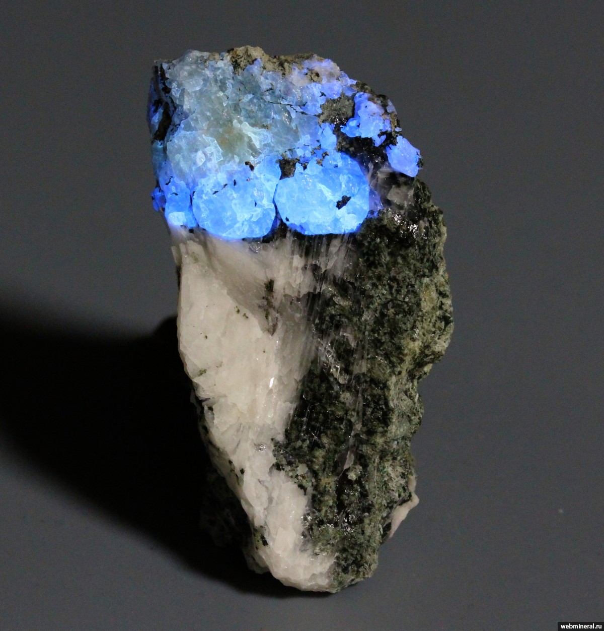 Скопления зерен бесцветного шеелита в пироксен-актинолитовом скарне. Нижняя часть образца сложена белым массивным кальцитом. Интересная особенность данного образца - различный цвет люминесценции скопления шеелита - желтоватый (центральная часть) и голубой (периферия). Обычной причиной желтой люминесценции являяется примесь молибдена, замещающего вольфрам в составе шеелита (т.н. "молибдошеелит").