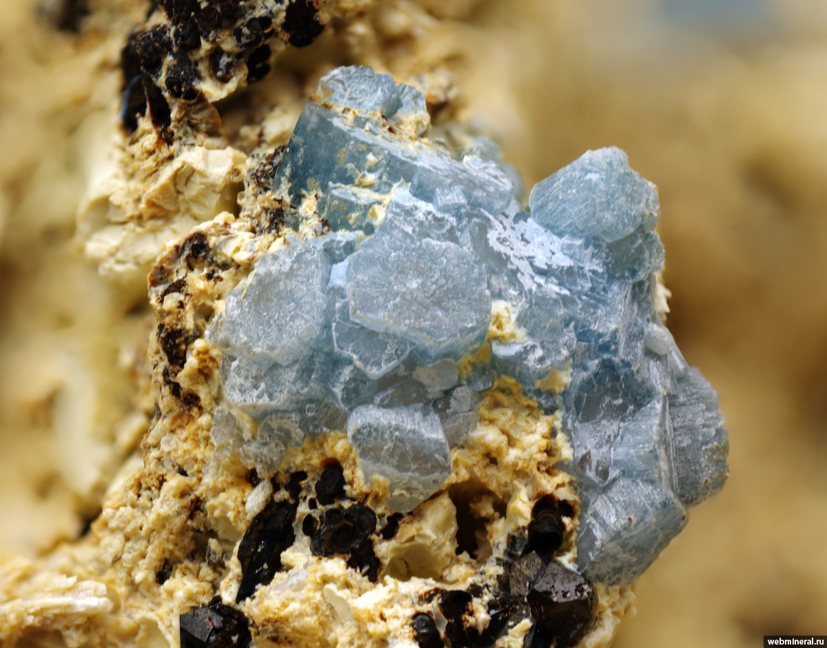 Сросток кристаллов голубого фторапатита и черные кристаллы нептунита на породе