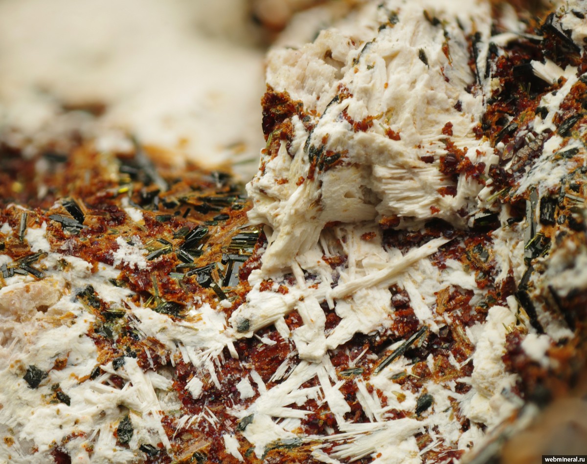Пластинчатый белый органоваит-Zn на красном зернистом манганнептуните с зелеными кристаллами эгирина. Образец из коллекции М.Л.Учителя.