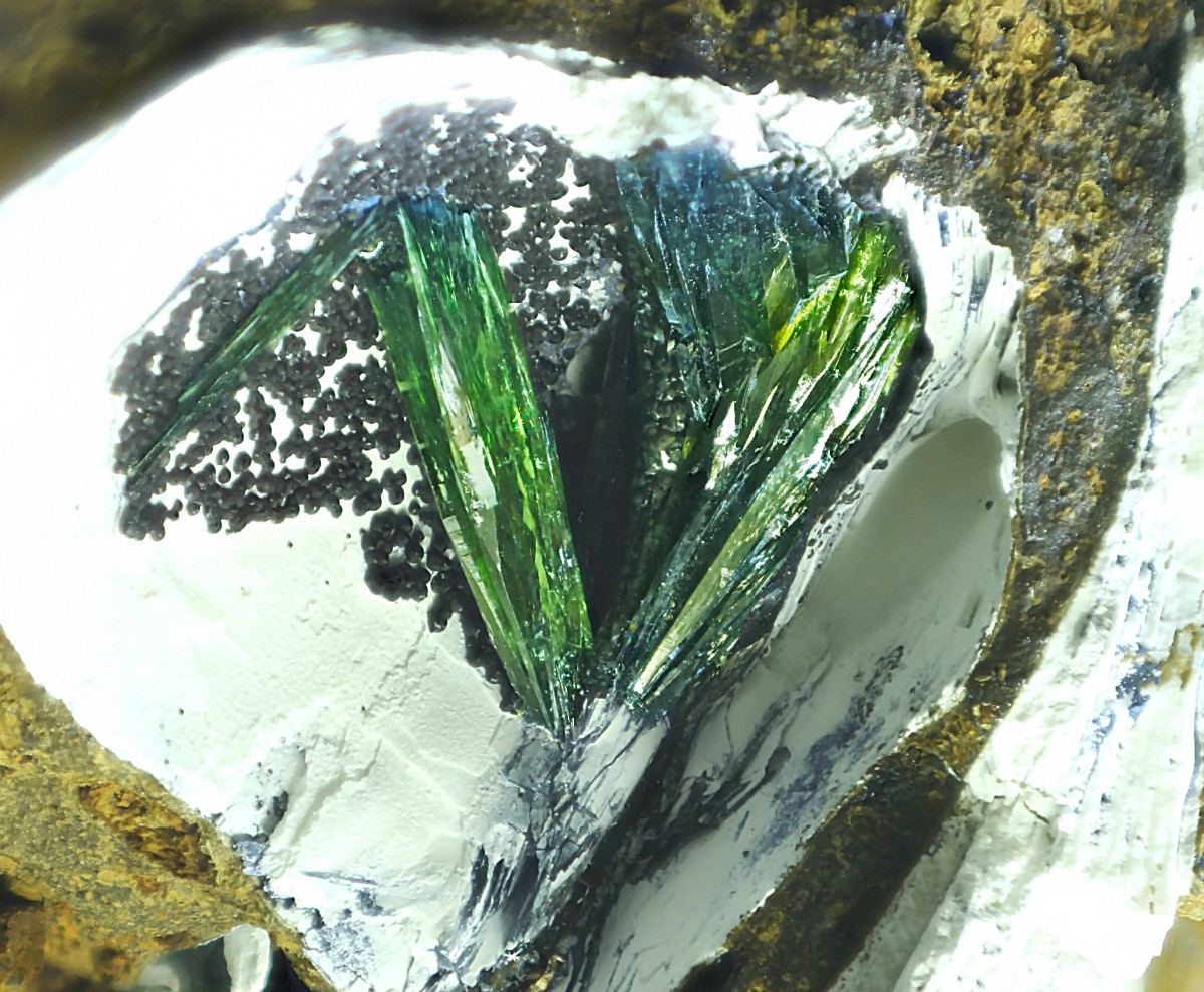 Кристаллы прозрачного зеленого вивианита на створке раковины моллюска в оолитовой железной руде.