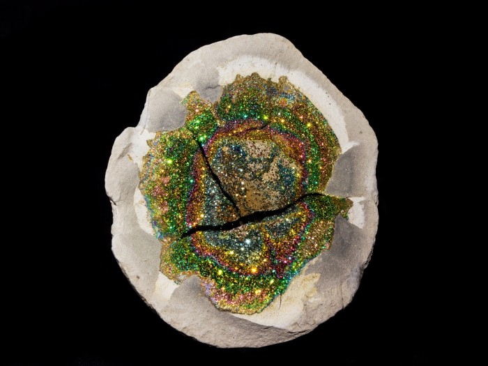 Корочка кристаллов пирита на поверхности трещин усыхания внутри глинисто-карбонатной конкреции.