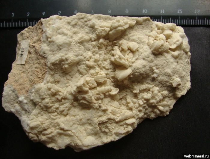 Изогнутые параллельно-волокнистые агрегаты и тонкозернистые корки калиевой селитры светло-желтоватого цвета на поверхности известковистого песчаника; колл. А. Тищенко, обр. № 0415, сбор 1996 г.