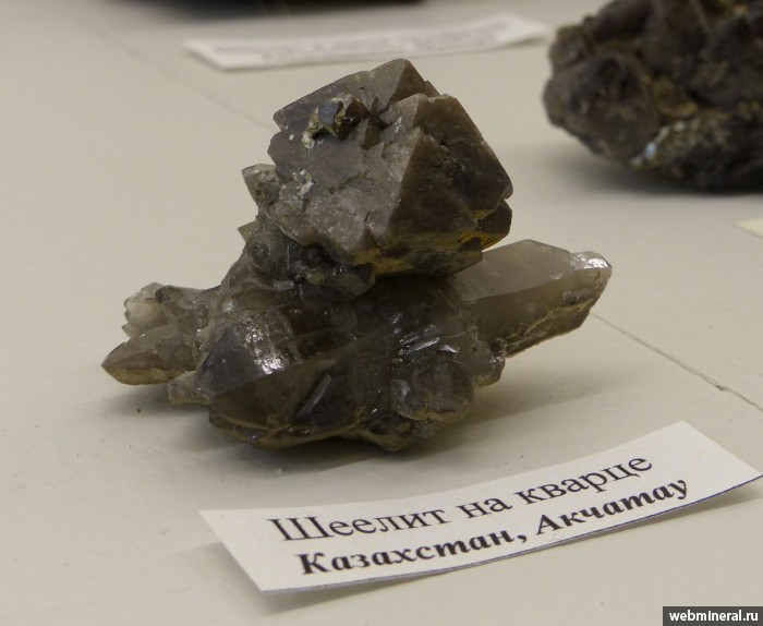 Дипирамидальный кристалл коричневого шеелита на друзе слегка дымчатого кварца. Образец из коллекции Мончегорского музея цветного камня им. В.Н. Дава (из собрания проф. И.И. Чупилина).