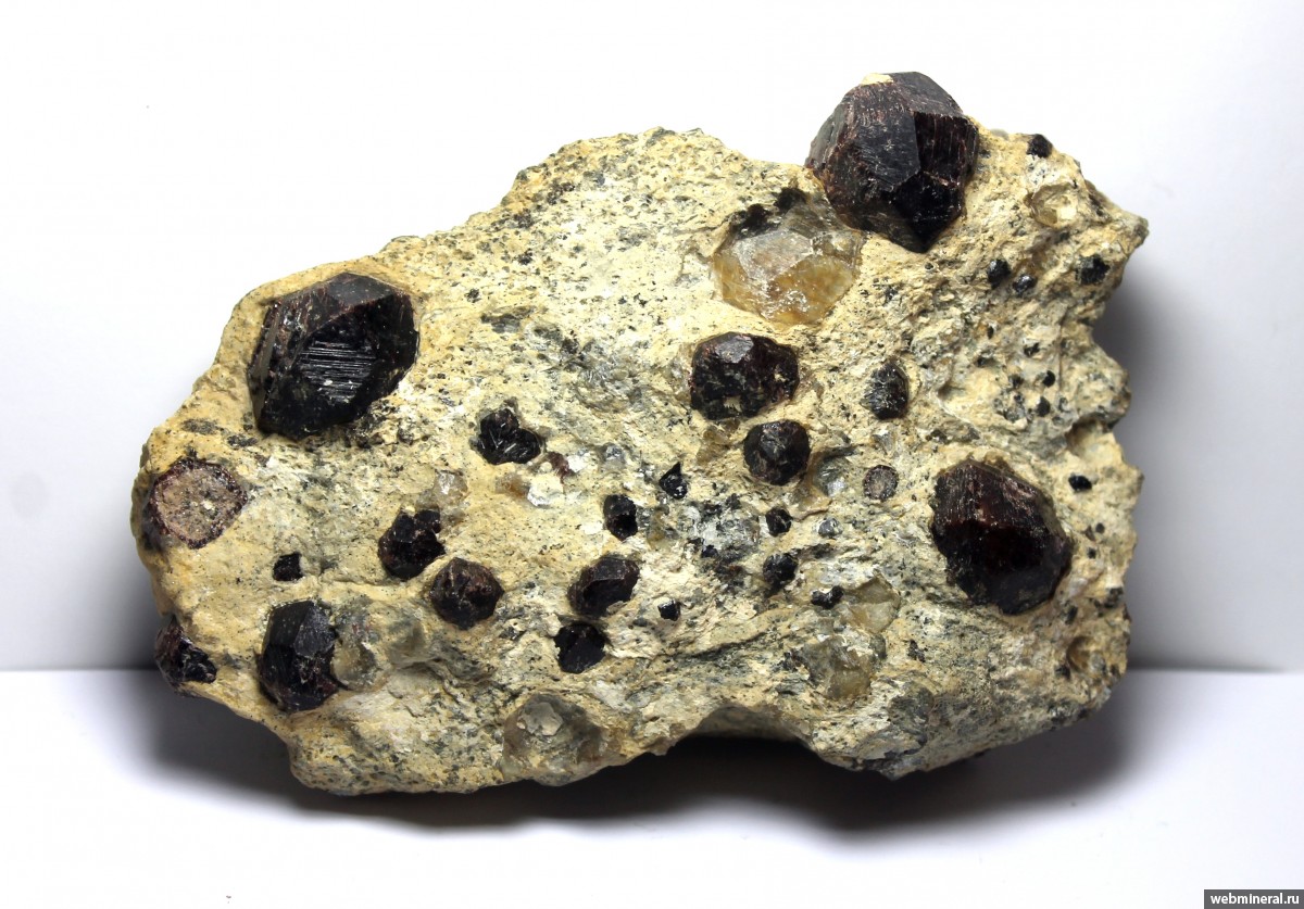 Кристаллы альмандина в гнейсе. В рубашке вокруг гранатов силлиманит.
