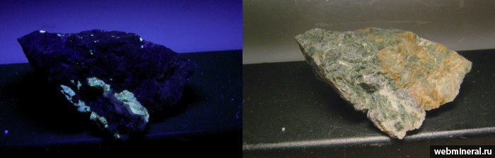 Серые зерна шеелита (разновидность молибдошеелит) в кальцитовых прожилках в зеленом геденбергитовом скарне. Слева приведено фото в ультрафиолетовом свете, показывающее желтовато-синюю люминесценцию молибдошеелита.