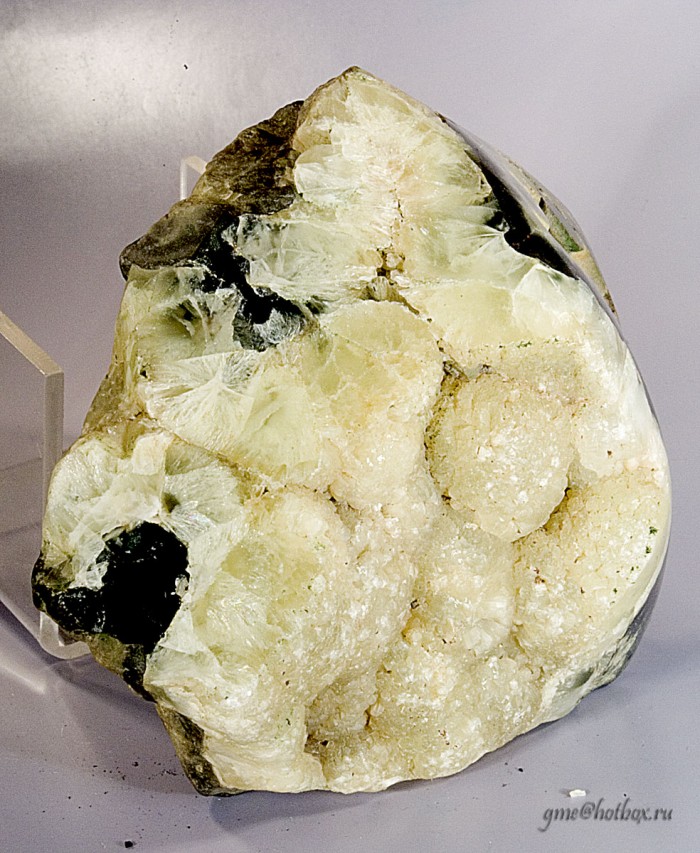 Корка полупрозрачного пренита радиально-лучистого строения в полости. Тыльная чась образца частично приполирована. Образец (о-2888) Геологического музея им. В.В.Ершова. Сборы Герасименко В.Я., 1989 г.