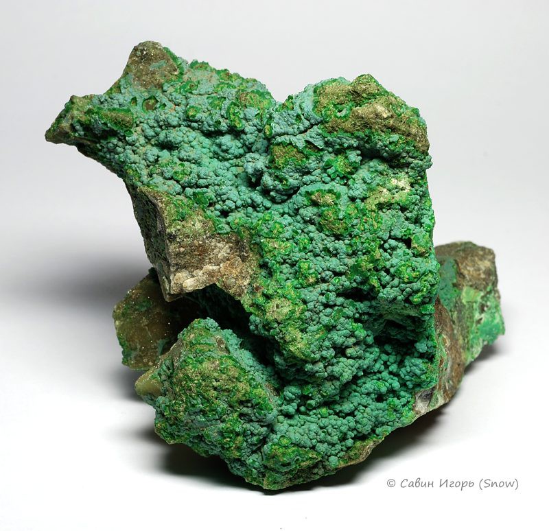 На образце представлен зеленый почковидный материал зонального строения, являющийся смесью различных минералов. Анализ материала на микрозонде показал присутствие зон с преобладанием никеля и зон с преобладанием магния. Порошкограмма дает как тальковые, так и серпентиновые пики, причем первых больше и они сильнее. Т.е. зеленые почки и корки образованы зональным срастанием нескольких минералов: Ni-содержащего талька (большая часть, зоны Mg>Ni) с виллемсеитом (зоны Ni>Mg), а также с небольшой примесью непуита-пекораита (зоны Ni>Mg)/антигорита (зоны Mg>Ni) и кварца. В голубых участках магний превалирует над никелем, поэтому эта фаза - Ni-содержащий тальк. Материал изучался Касаткиным А.В. рентгенографически и на микрозонде в начале 2011 года на аналогичных образцах, собранных Михаилом Цыганко.