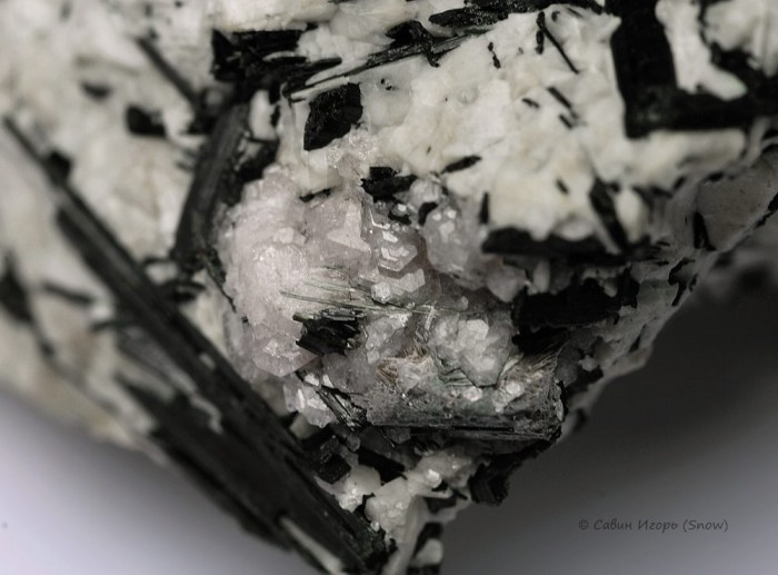 Сросток бледно сиреневых кристаллов вадеита размером 1 см зелеными игольчатыми кристаллами эгирина и кристаллы черного эгирина длиной до 1,6 см на полевом шпате.