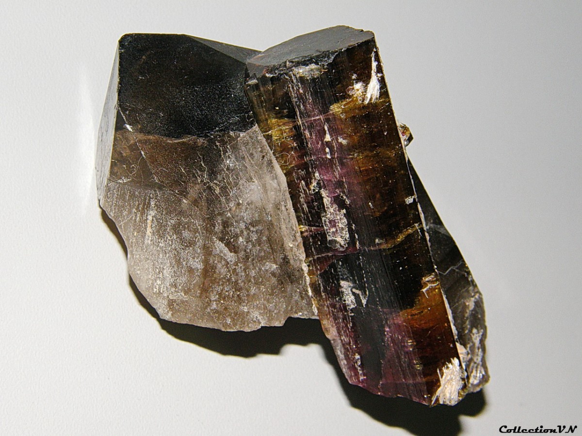 Кристалл полихромного турмалина на кристалле дымчатого кварца. (размер турмалина 6.5 на 1.5 см)