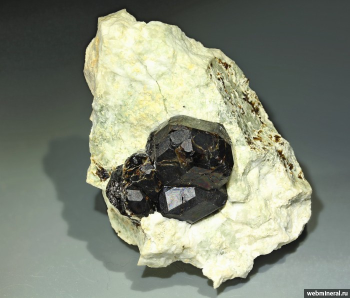 Сросток кристаллов темного андрадита в белом кальците. Самый крупный кристалл андрадита 15 мм. Находка - 2015 год.