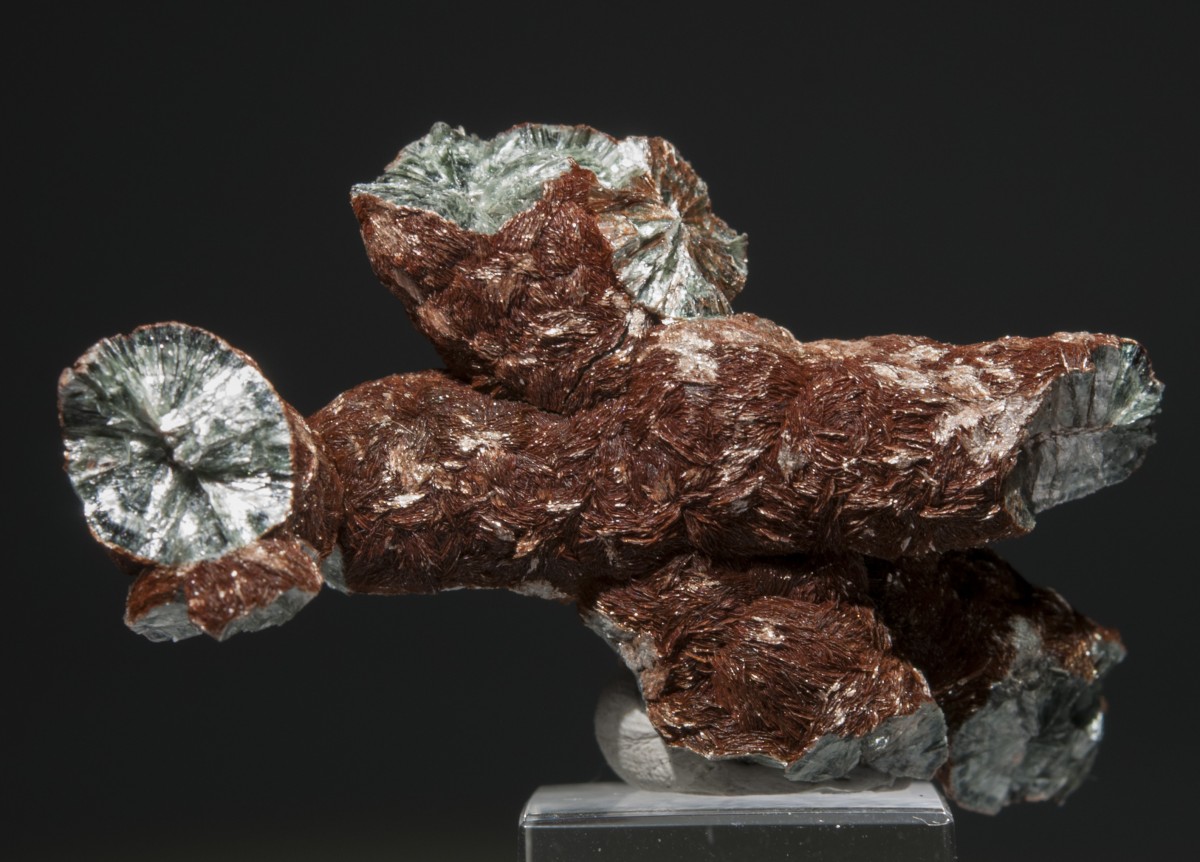 Двухголовый псевдосталактит клинохлора, покрытый гематитом.