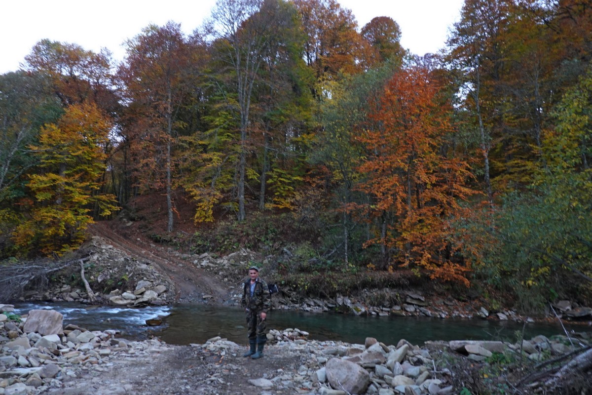 Дальше нужно было подниматься по долине Кяфара. Здесь Кяфар еще довольно полноводный и было решено хоть немного пройти по борту долины, а не по руслу. Прямо от слияния шла крутая лесовозная дорога, мы отправились по ней, пока она не начала сильно отворачивать в сторону.