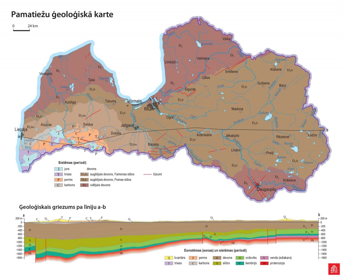 "Не считая слоя четвертичных отложений, который покрывает большинство территорий данной страны, породы представлены доломитом девонского периода, который распространён во многих частях страны. Повсеместно ведётся добыча доломита для использовании этого природного ресурса в качестве щебня, а также облицовочного материала. (Залежь доломита показана на карте. Тут же можно увидеть местоположения действующих карьеров на 2013 год, отмеченных тёмными ромбиками. Жёлтые точки - места возможной добычи доломита). Также с 50ых годов прошлого века разрабатывается глиняное месторождение Лоде (Lode), известное палеонтологическим музеям многих стран, как источник окаменелостей панцирной рыбы. Имеются залежи гипса (также девонского периода) в центральной части страны, около столицы - Риги (разрабатываемое во времена СССР месторождение Сауриеши (Saurieši), а также современное месторождение Саласпилс (Salaspils), находящееся неподалёку). Также, в западной части страны имеются залежи пермского известняка (ныне разрабатываемое месторождение Кумас (Kūmas) и множество других, уже отработанных карьеров). Также присутствуют отложения карбона и триаса, но практического применения они пока не имеют. А в юго-восточной части страны имеется небольшая территория, представленная известняками, песками, чёрными глинами и бурыми углями юрского периода."