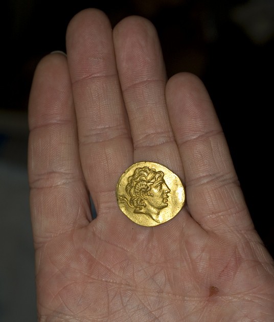 Древнегреческая монета найденная местными жителями внутри черепа при рытье колодца. По древнему обычаю монету клали в рот покойнику для покупки хорошего места на том свете.