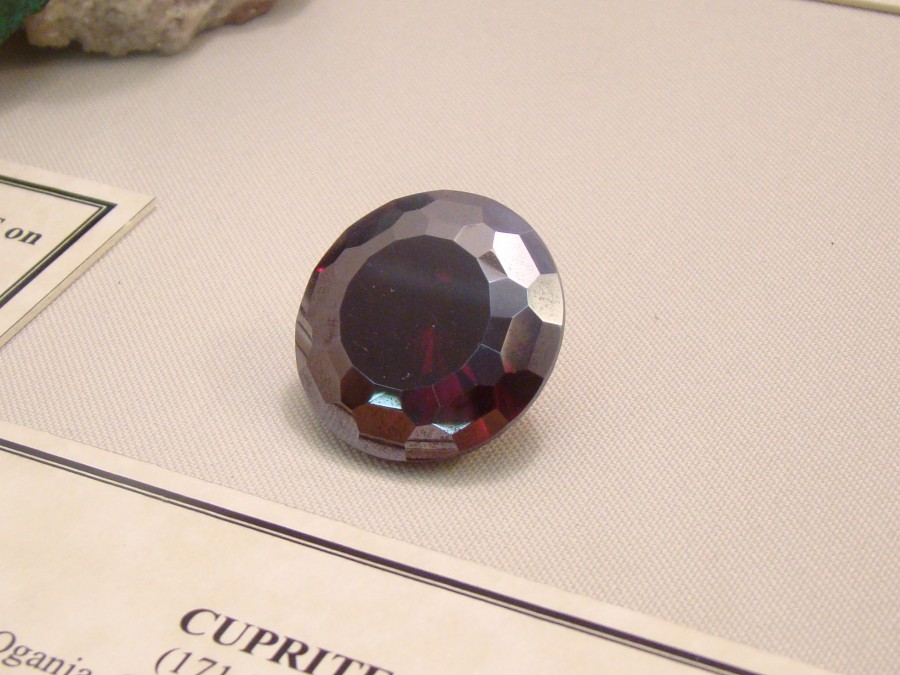 Гитантская (171,82 карата) огранка из прозрачного кристалла куприта, добытого в Намибии. Образец из экспозиции Смитсониановского музея естественной истории.